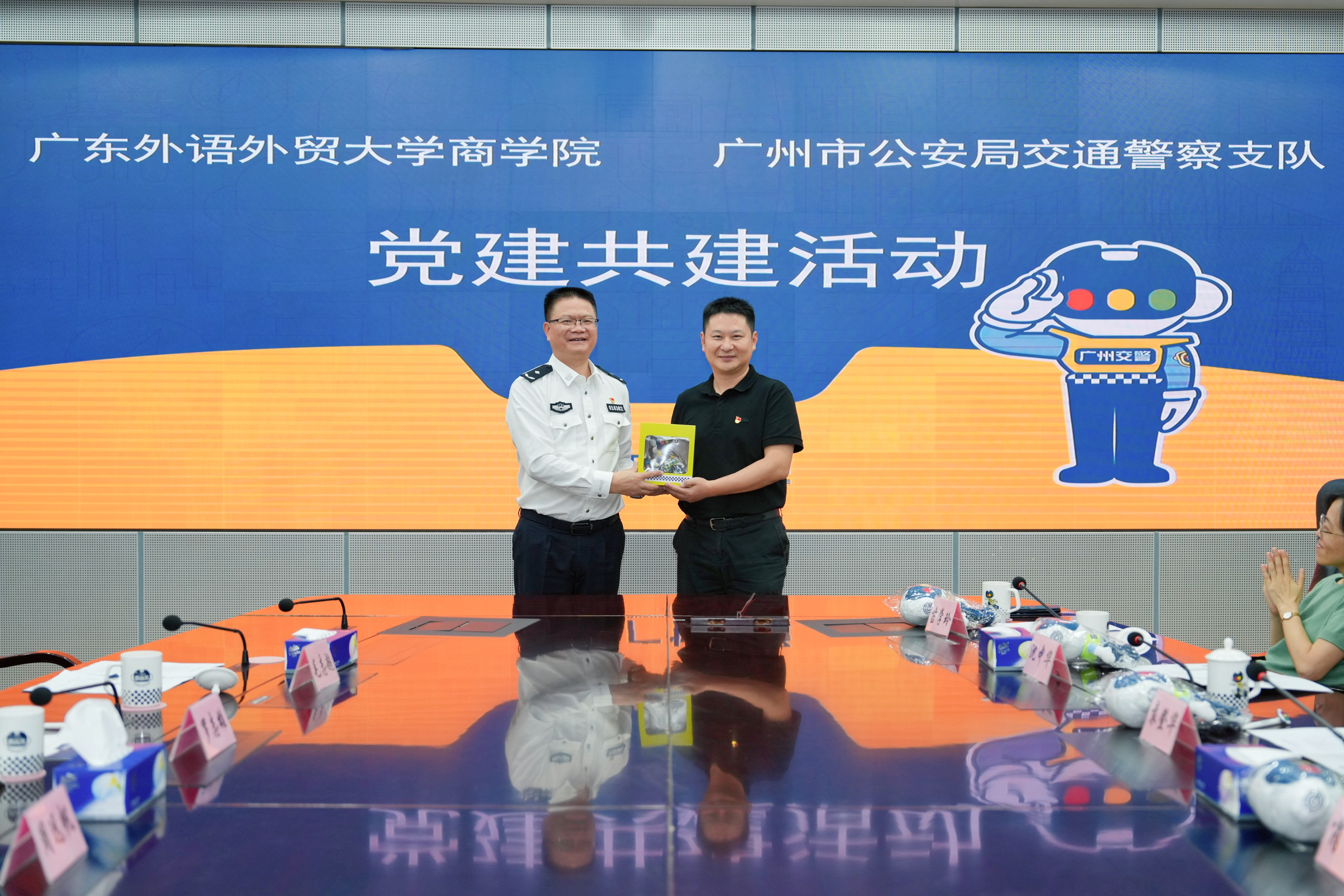 11月14日下午,我院与广州市公安局交通警察支队(以下简称“交警支队”)开展党建共建活动。交警支队党委副书记、政委周远帆,党委委员、政治处主任罗志雄,政治处副主任谢欣,战巡大队中队长钟勇明,团委书记毛志超等热情接待了我院一行,并举行党建共建座谈会。商学院党委书记肖锋,党委委员、副院长(主持工作)袁登华,市场营销教工党支部书记王秀芝,电子商务教工党支部书记沈中华,工商管理系主任曾驭然以及教工、学生党员代表参加活动。此次活动旨在深化双方党组织之间的交流与合作,提升党建工作水平,坚定为民服务的初心,凝聚起推动工作进步的强大力量。
