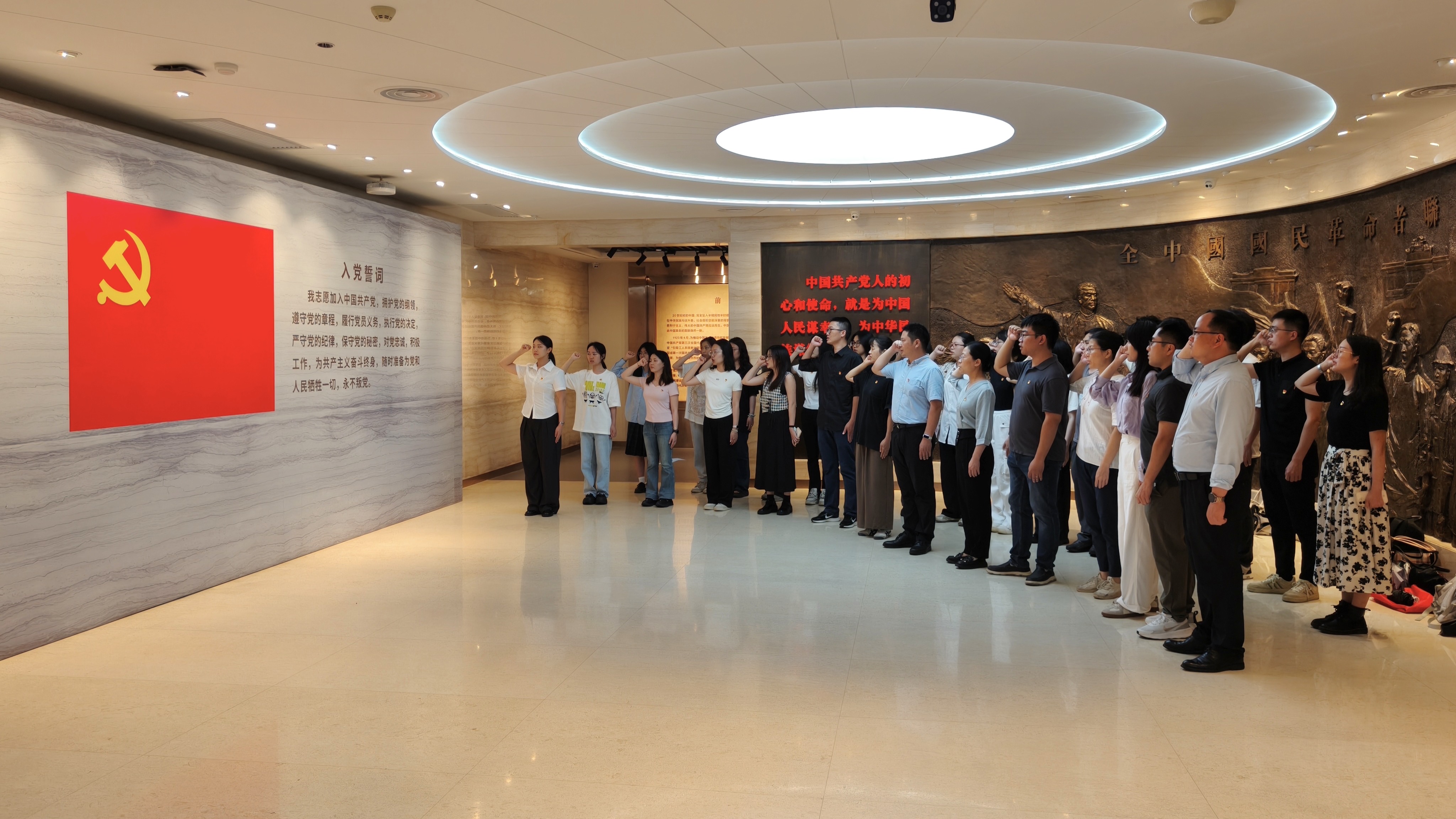 参观结束后,全体党员面向鲜红的党旗,高举右拳,庄严地重温入党誓词。铿锵有力的誓言在纪念馆内回荡,师生党员们重温入党时的赤诚初心,目光坚定地许下承诺:为共产主义奋斗终身,随时准备为党和人民牺牲一切,永不叛党!