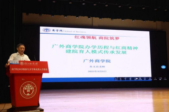 2025年9月8日,商学院在大学城校区大会堂举行“红魂领航·商学筑梦”——商学院办学历程与红商精神融合示范党课。本次活动作为2025级新生入学“必修课”,由老党员、广东省教学名师、商学院原院长朱文忠教授主讲。本次党课聚焦商学院办学历程与红商精神的深度融合,旨在引导新生筑牢理想信念、明确使命责任,为培养新时代高质量商科人才奠定思想基础。商学院党委书记肖锋、副书记沈长霞、新生辅导员及全体新生共同参与。