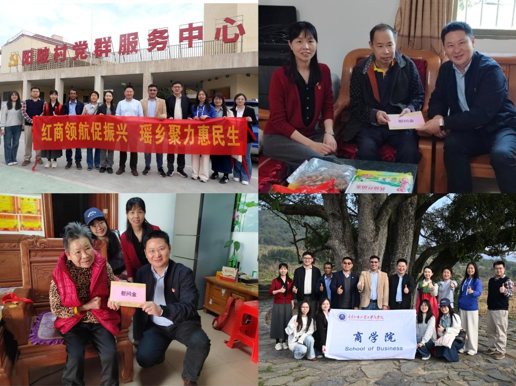 随后,商学院一行到阳陂村党群服务中心进行参观学习,深入了解“水上粮仓”改造项目及农文旅发展计划,感受乡村振兴的丰硕成果和盎然生机;在游溪镇瑶客共生广场,大家沉浸式感受了瑶、客两族文化交融的独特魅力以及当地对古树的重视和保护。期间,走访慰问组还前往韶关市乳源县桂头镇均村帮扶点开展乡村振兴慰问工作,与当地老党员深入交流,并送上慰问金和慰问品。