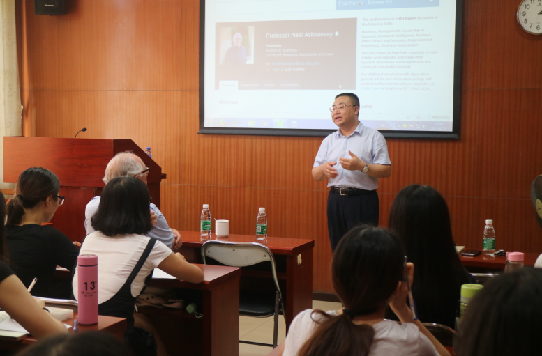 2017 日9月25日下午,澳大利亚昆士兰大学商学院NealAshkanasy 教授与商学院师生分享了“What does it take to become a successful OB scholar”,陈国海、安凡所等教授以及商学院硕士研究生参加了本次学术讲座。讲座由商学院副院长袁登华教授主持。