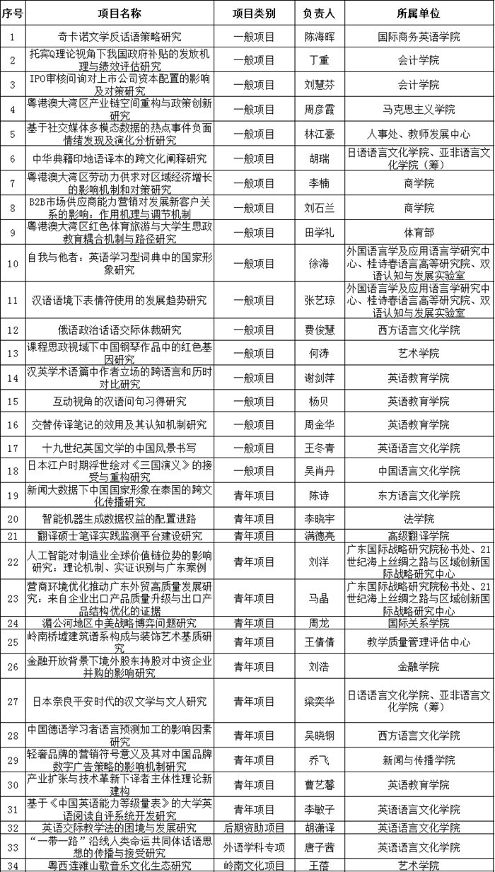 日前,2021年度广东省社科规划项目立项名单正式公布,我校获资助项目33项,其中一般项目18项、青年项目13项、后期资助项目1项、外语学科专项1项,获资助数连续两年居全省第一。获资助项目涵盖14个学科,高水平大学学科占总立项数73%。本年度还获资助1项岭南文化项目。