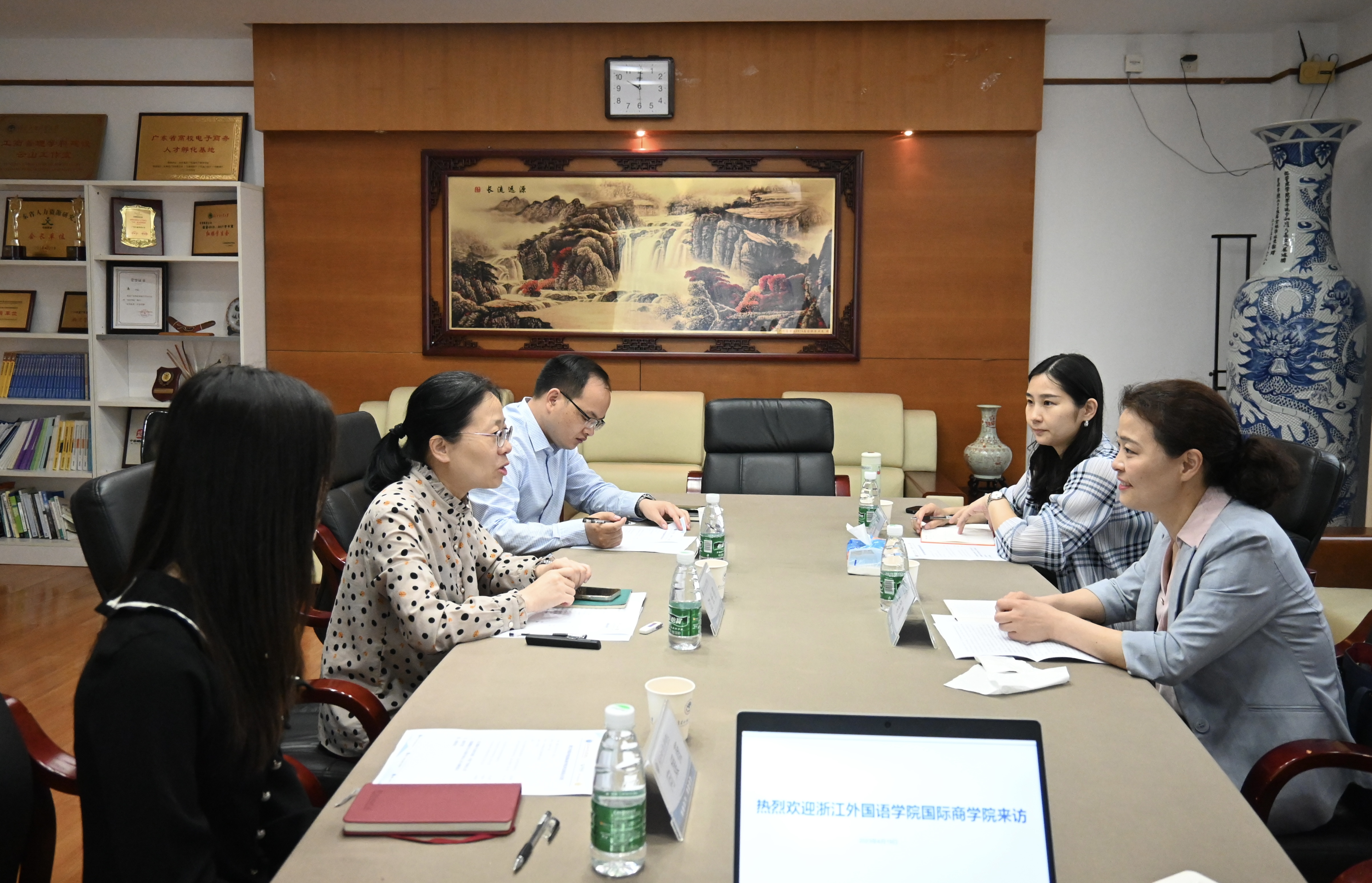 范徵对我院的接待表示感谢,介绍了同行参会人员及此次调研的目的与重点。宋树理介绍了浙外的院系设置、办学现状、学生规模与实验室建设情况。随后,双方就EPAS国际认证申请的重难点、全英教学与教材使用、学生国际化、电子商务专业的发展、社会服务制度建设等问题进行座谈交流。