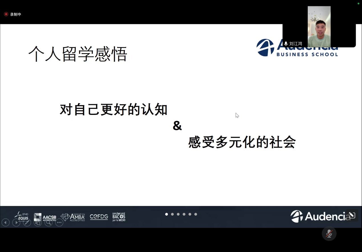 校友刘江鸿以自己的亲身经历为蓝本,介绍了法国留学及该项目的基本情况。他坦言道:“法国留学的经历通过多种方式让我有机会能够充分挖掘自我的可能性,使我成长为一个独立的人,明白‘做自己’便是其一成功之道,进一步地提升了对自我的认知,感受到了更加多元化的社会。”刘江鸿亦以过来人的经验向师弟师妹们提出了如提早准备法语、丰富学术技能等建议,使参会的同学们受益良多。