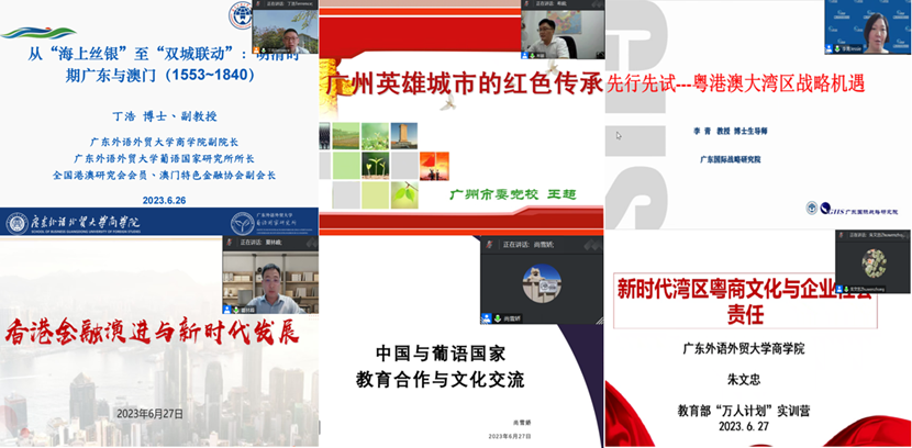 为增强粤港澳高校学生对粤商精神的了解与传承,加深学生对湾区商贸文化的系统了解,增强学生对传承新时代商贸文化的自豪感与使命感,2023年6月25日至7月1日,广东外语外贸大学商学院与港澳地区高校联合举办“湾区青年粤商精神传承与创新能力提升实训营”(以下简称“粤商精神”实训营)和“‘古港新韵’:湾区商贸文化的新时代传承实践研修班”(以下简称“古港新韵”研修班)。本次项目采用线上专题讲座和线下实地走访、企业调研相结合的形式,吸引了来自粤港澳大湾区各高校约60名学员参与。