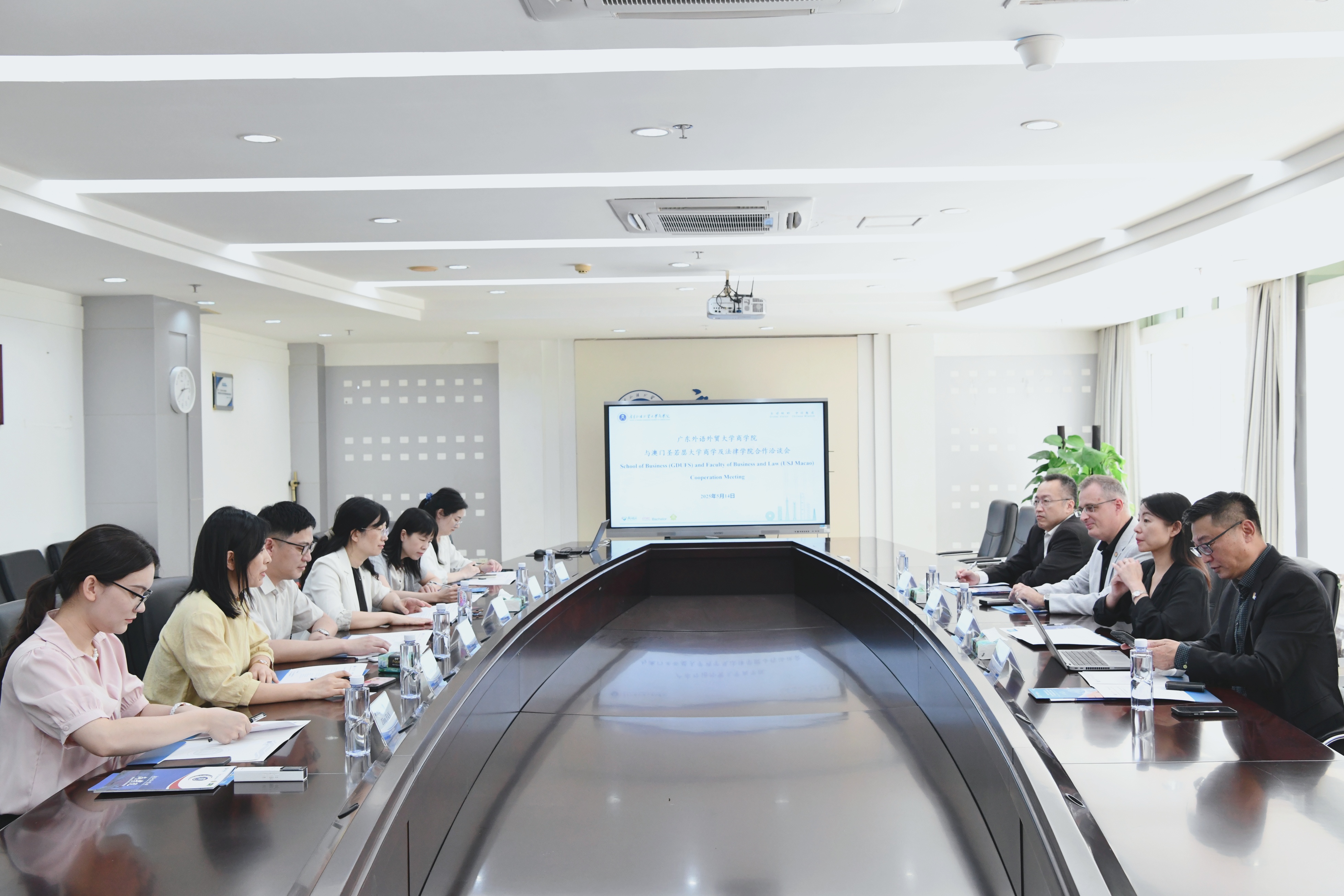 5月14日下午,澳门圣若瑟大学商学及法律学院院长Jenny Phillips、工商管理学士课程主任Alessandro Lampo、助理教授Michael Ha,发展事务处处长杨承东来我院洽谈合作。广外商学院副院长(主持工作)韩小花、副院长丁浩、国际事务办公室主任刘淑敏、创新班教研室副主任关翩翩、国际事务办公室主管王莹以及MBA中心国际事务主管范紫惠出席本次活动。会议由刘淑敏主持。