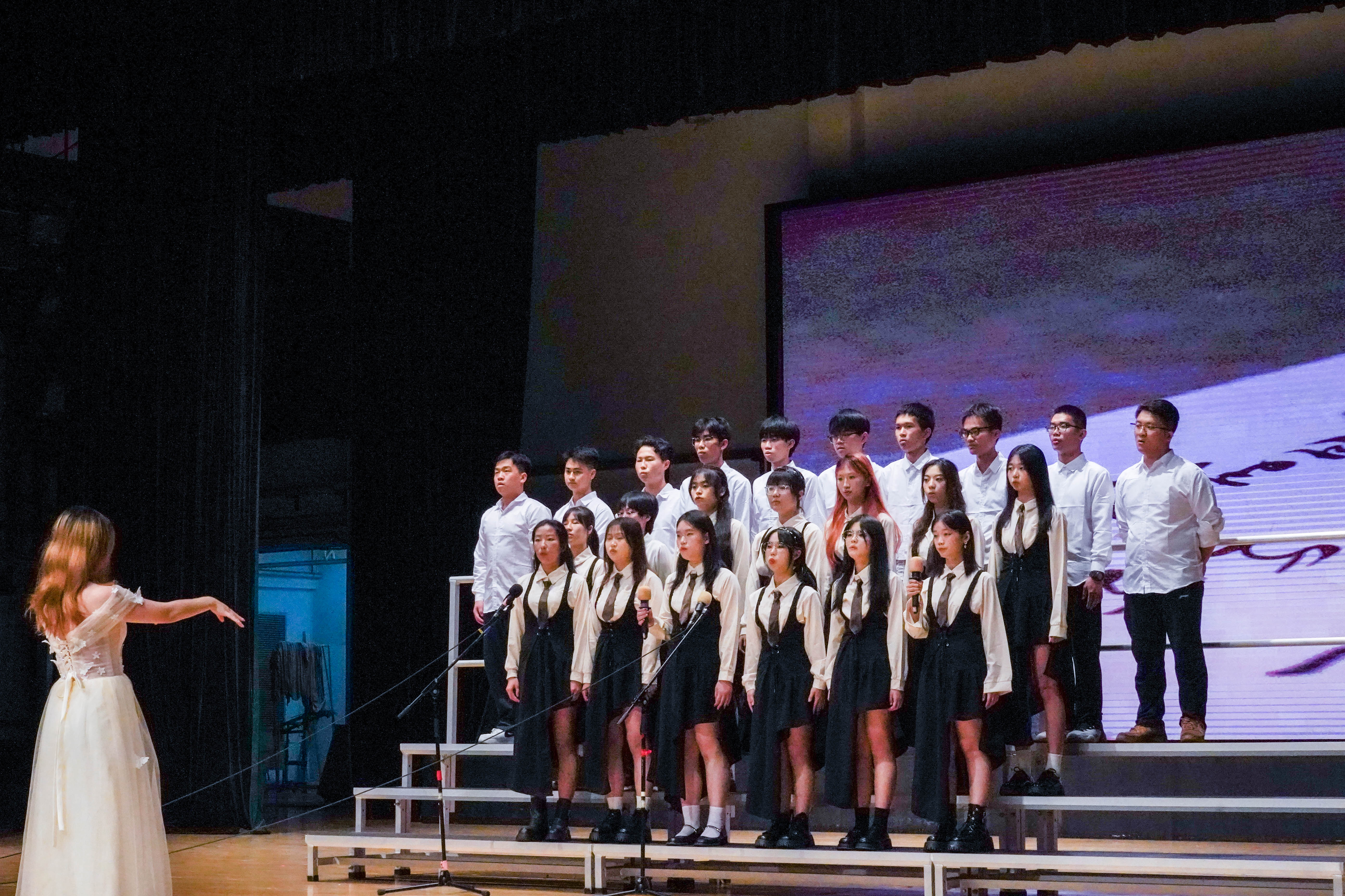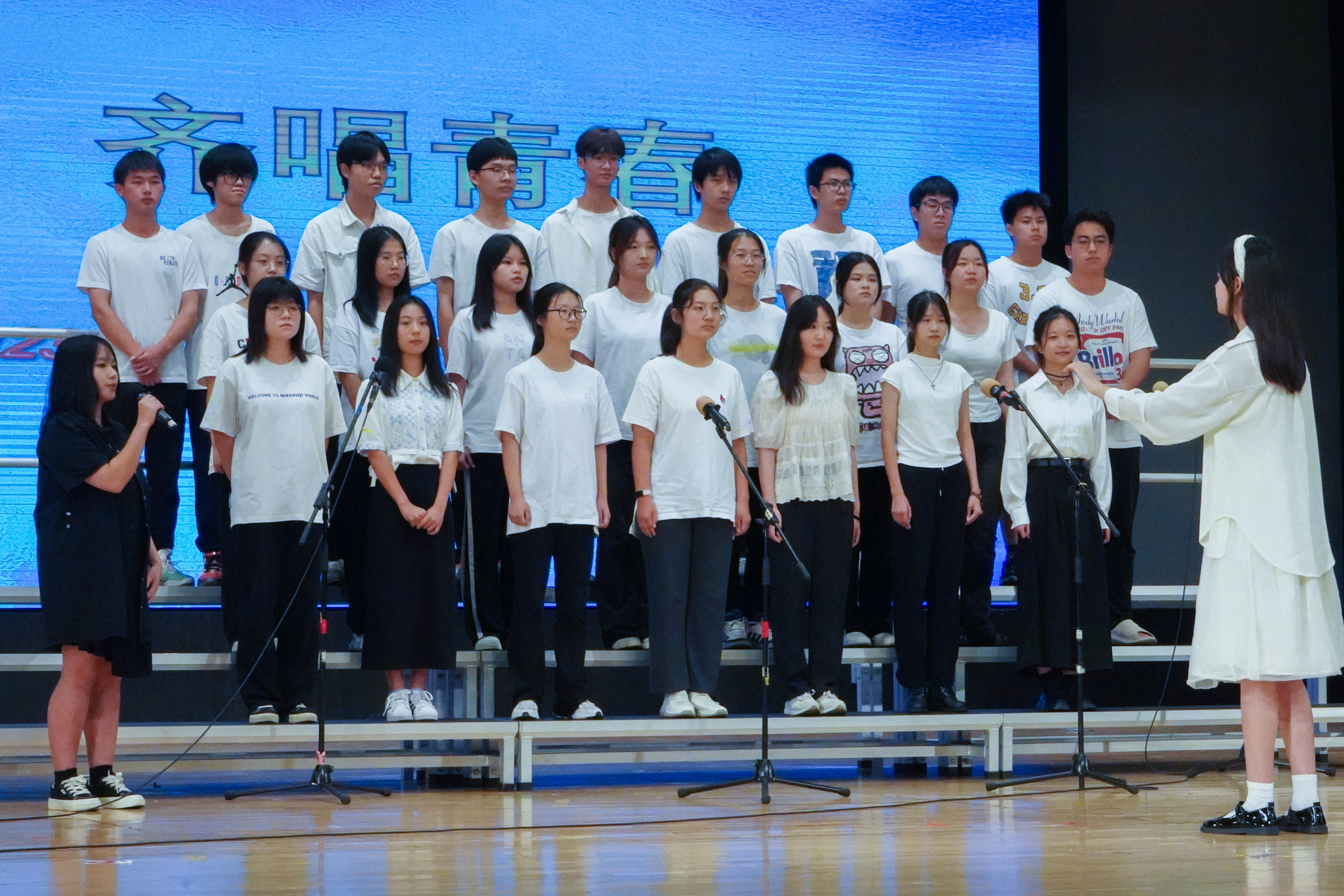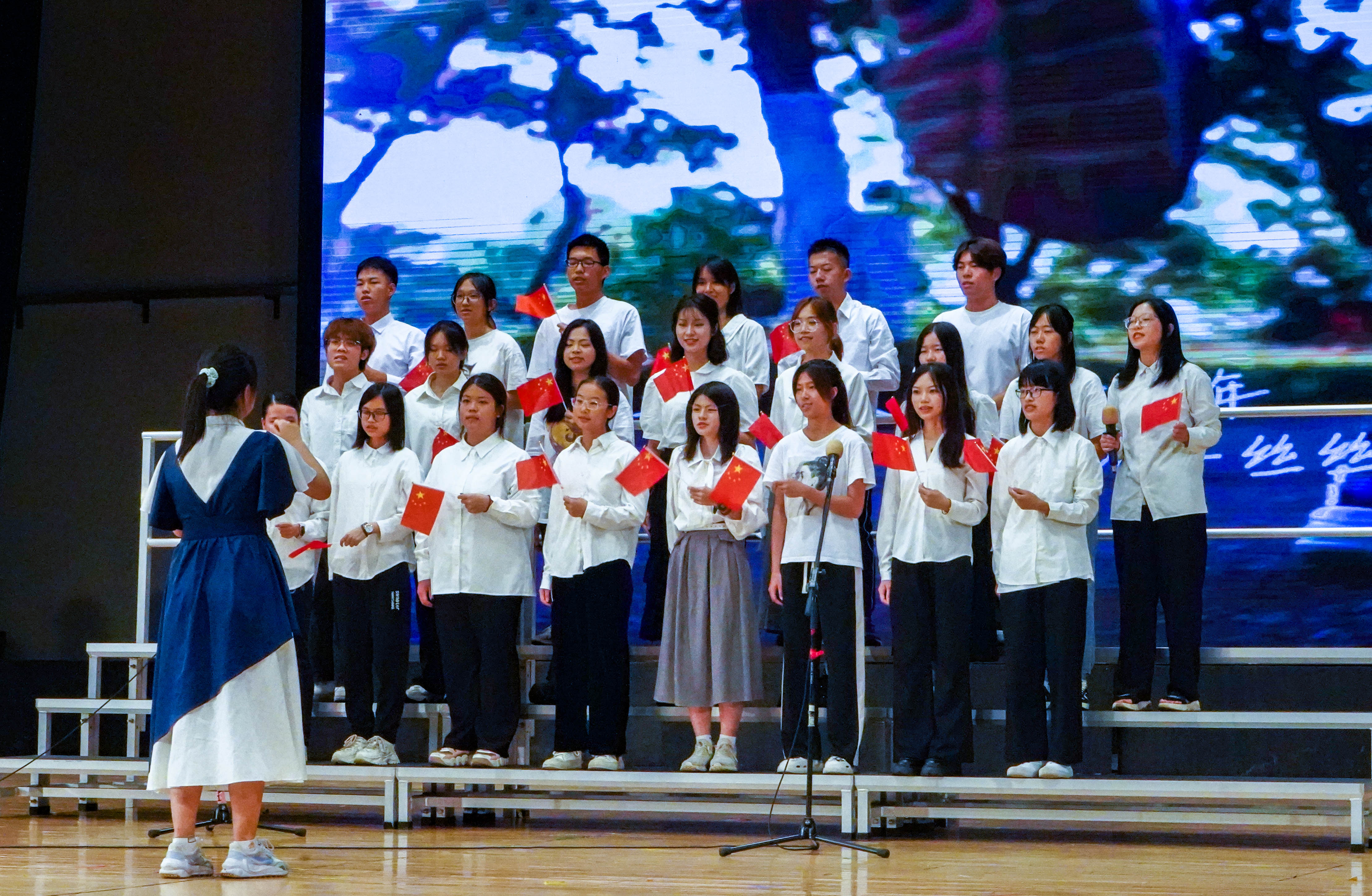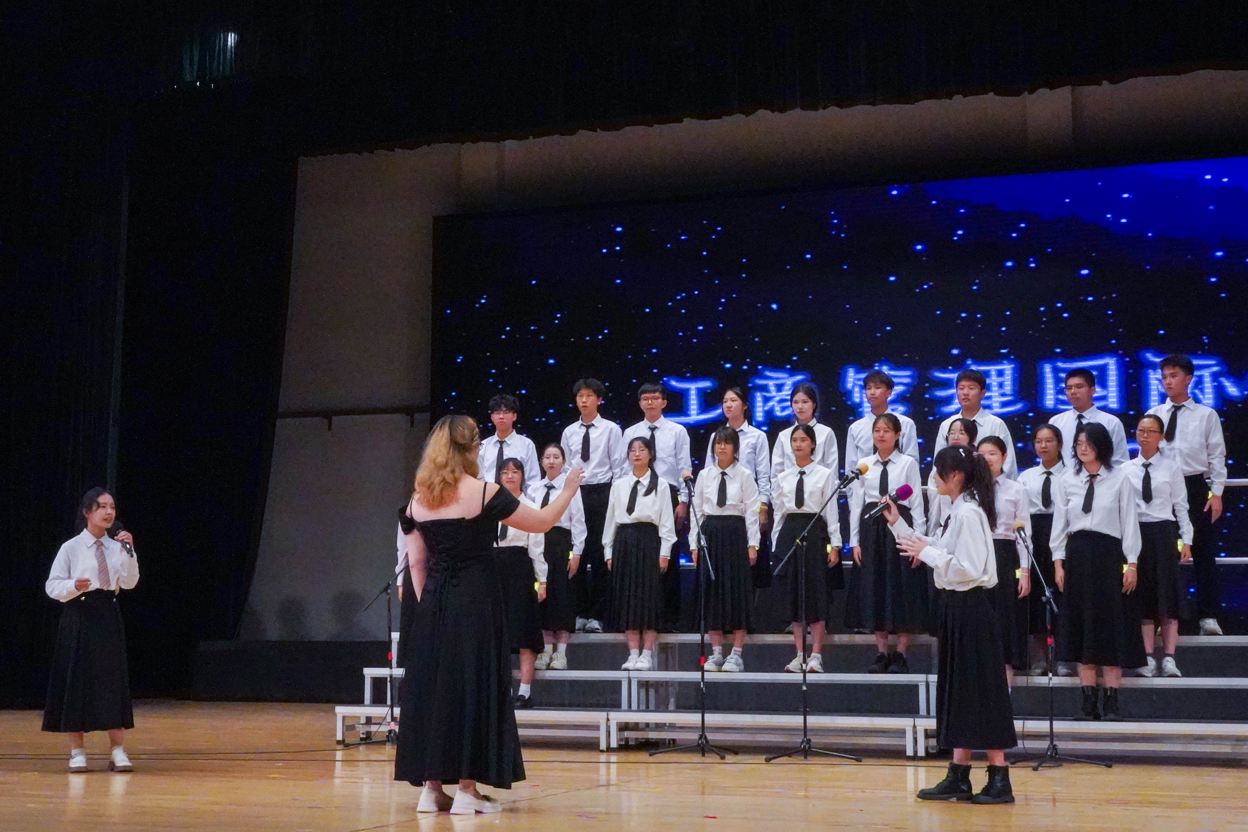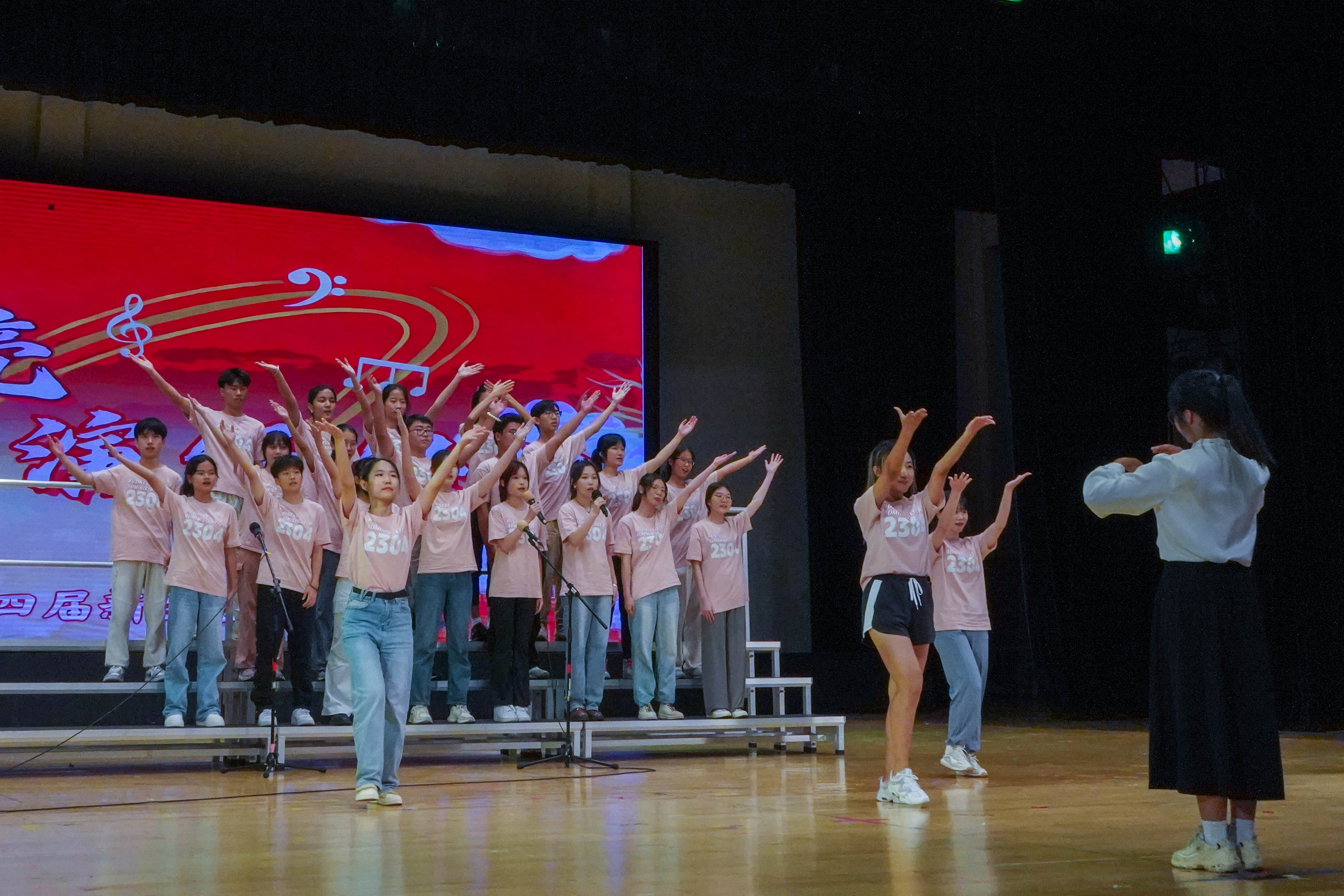 最后来到激动人心的颁奖环节。获得本次新生合唱节一等奖的班级是工管2303班,获得二等奖的班级是商创2301班、国创2301班,共有四个班级获得了三等奖,分别是工管2307班、工管2305班、工管2304班、电商2301班,获得最佳指挥奖的是商创2301班的陈梓茵与国创2301班的曾颂殷同学。