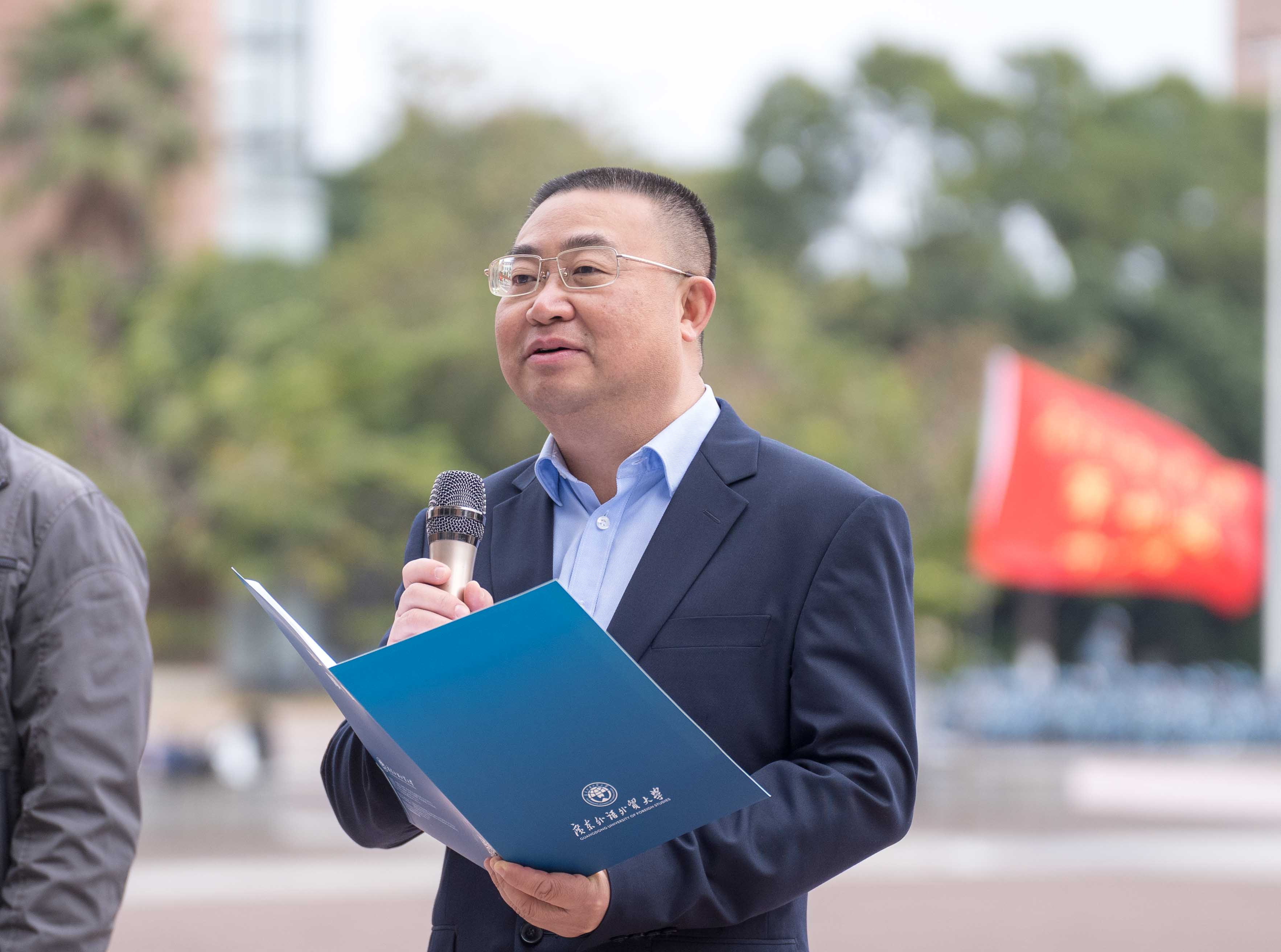 首先,袁登华代表学院向全体军训教官和参训同学表示真切的慰问,对同学们在军训中表现出来的高昂的热情和取得的进步表示高度称赞,对认真负责、严谨训练的教官们表示衷心感谢。他强调,军训是同学们踏入大学后的必修课。军训的目的和意义不只是让同学们强身健体,更重要的是让同学们的意志得到锻炼,在军训中增强集体意识与纪律意识,不断树立家国情怀,培养责任与担当意识。他勉励同学们抓住军训的机会,磨炼意志、塑造品格,用耐心和决心展现商院学子的卓越风采,争当时代新青年,立志将自己培养成德智体美劳全面发展的社会主义建设者和接班人。