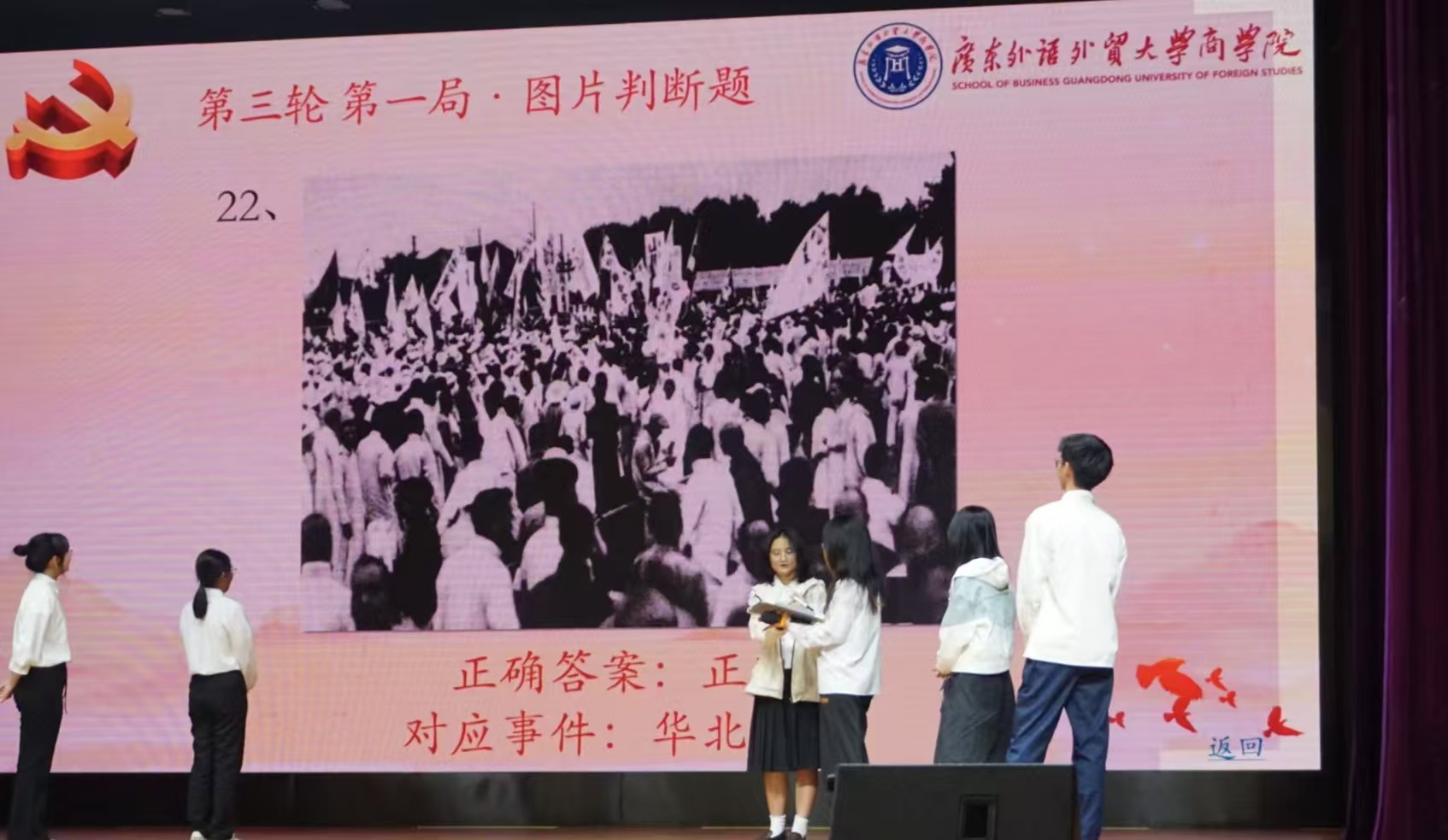第二轮积分赛包含排序题、匹配题、观影题。选手们分工协作,有策略地选题作答。各组队员们沉稳应对,凭借扎实的党史知识积累,为团队积攒优势。各队竞争激烈,“听党话就队”和“光宗耀祖队”比分相同,加赛一轮,最终“光宗耀祖队”和“青年先锋队”两支队伍成功晋级。
