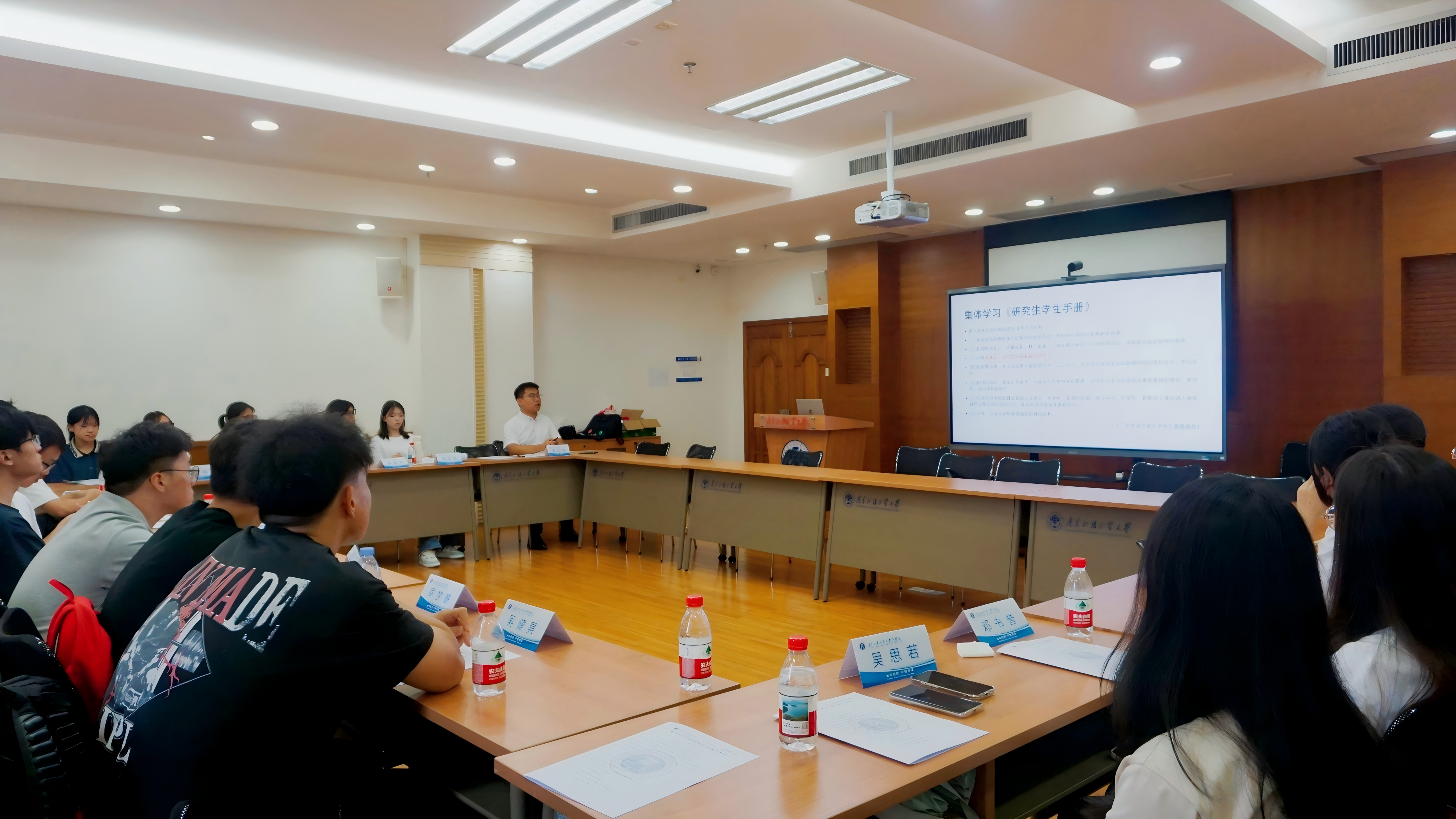2025年9月11日,商学院在大学城校区行政办公楼第六会议室召开2025级学术型研究生新生见面暨入学教育会。商学院党委书记肖锋、副院长(主持工作)韩小花、党委副书记沈长霞、研究生办公室主任孙海龙、研究生教务老师刘超杰、研究生辅导员黄仕恒、研究生导师代表以及2025级商学院全体学术型硕士研究生出席了本次会议。