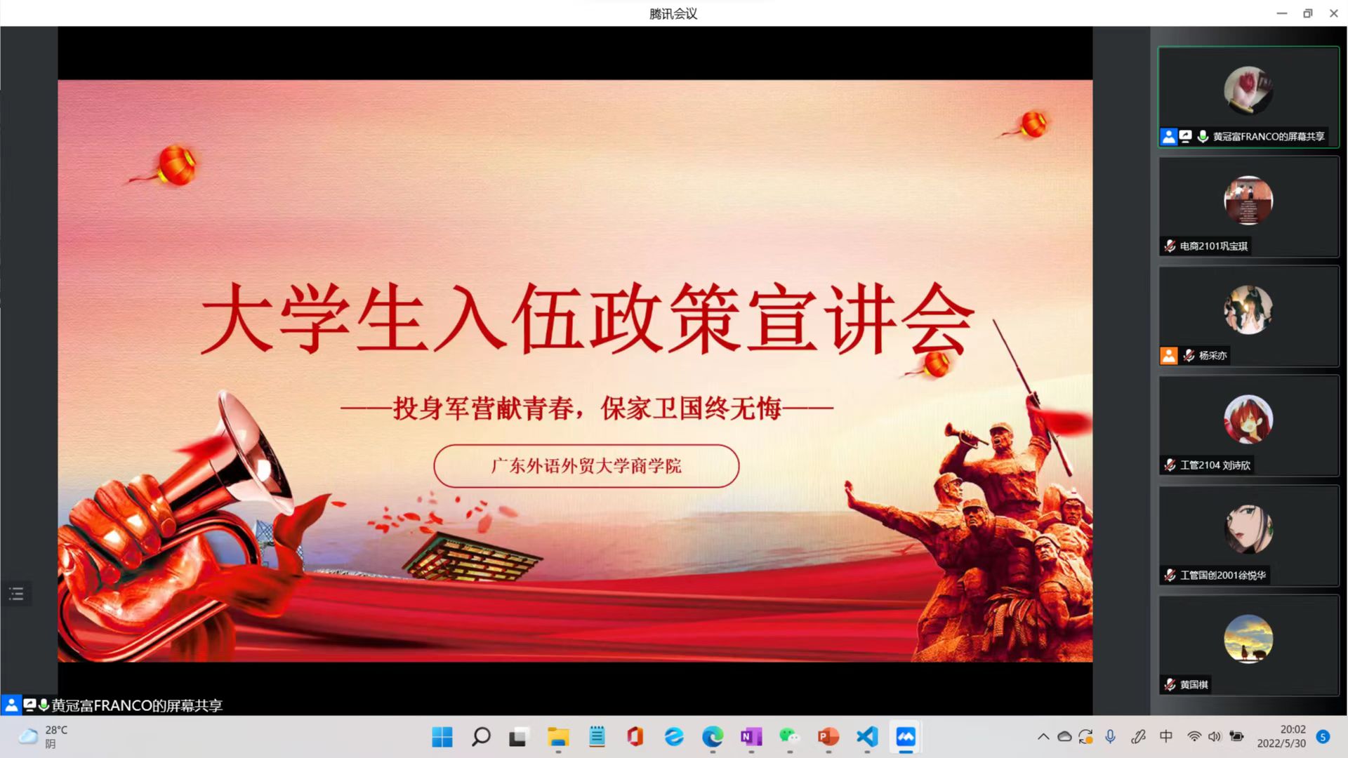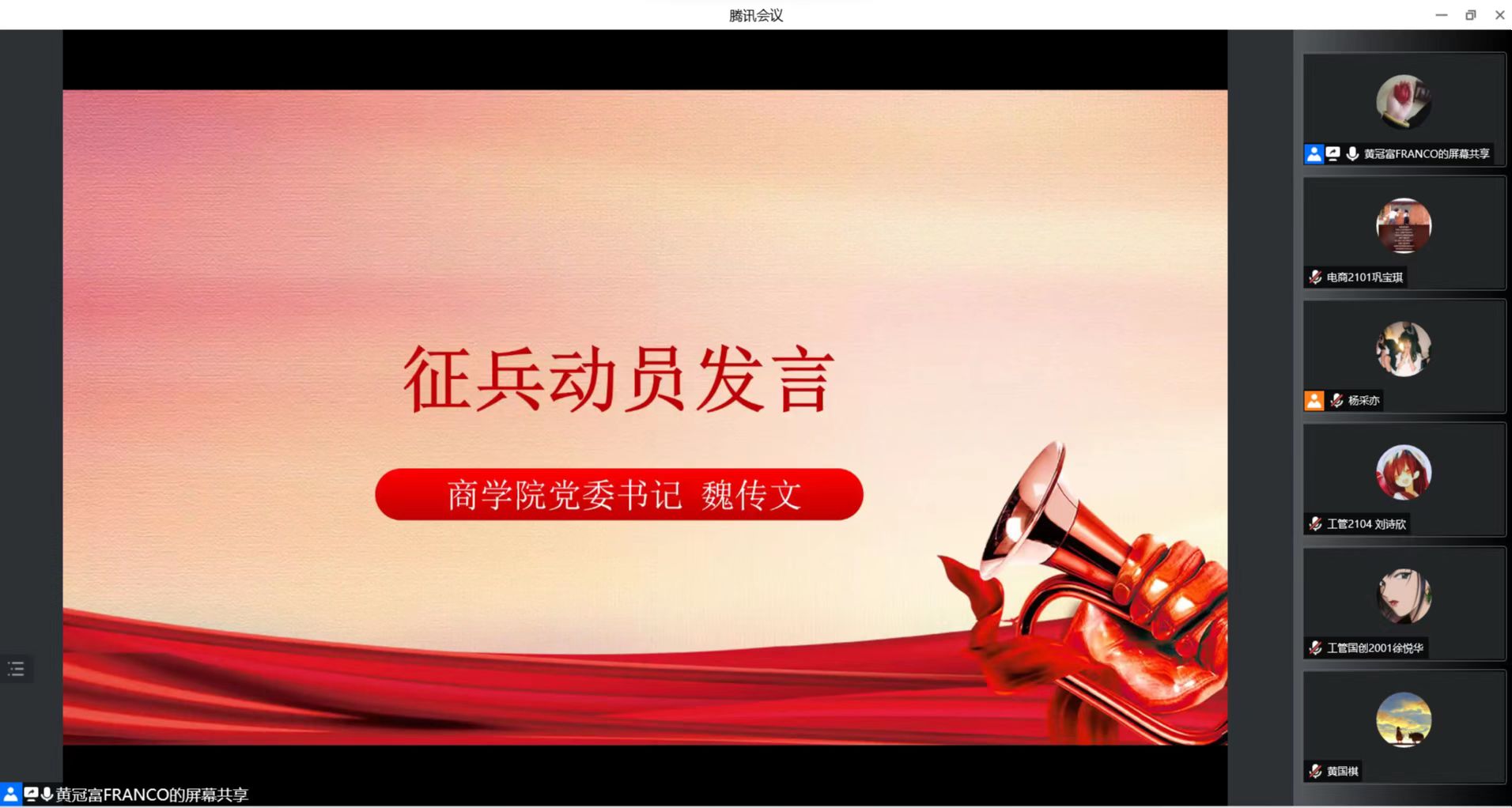 为贯彻落实国家征兵政策,鼓励在校大学生积极响应国家号召应征入伍,投身军旅,绽放青春,5月30日晚,商学院在腾讯会议召开2022年大学生征兵入伍动员大会暨政策宣讲会。商学院党委书记魏传文、党委副书记沈长霞,武装部国防教育科科长朱永海,全体辅导员、2019级退役士兵叶斯泰·巴合提江及各年级学生代表参会。