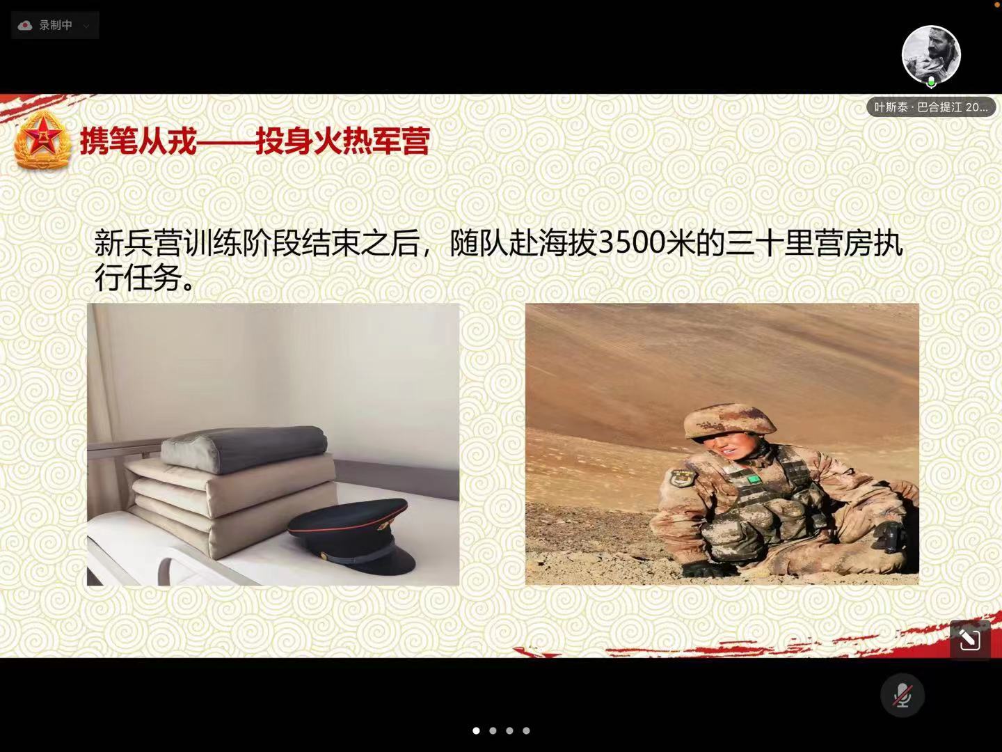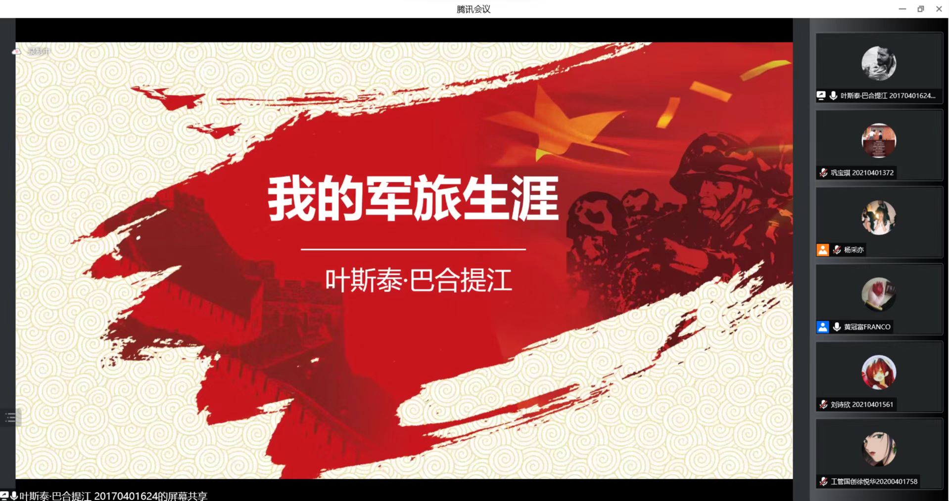 叶斯泰·巴合提江向同学们分享了他的军旅生涯,从“入伍前”“投身军营”“退伍后”三个阶段讲述了自己的参军入伍的经历和心得体会。他表示,军队是一所大学校,在部队的生活让他明白了今天所有的美好都来之不易,参军入伍锻炼了他的意志力和团队意识。同时,他号召同学们积极加入到祖国的国防建设当中,为保卫祖国和人民安全贡献力量,为祖国的国防事业增添一份广外力量。
