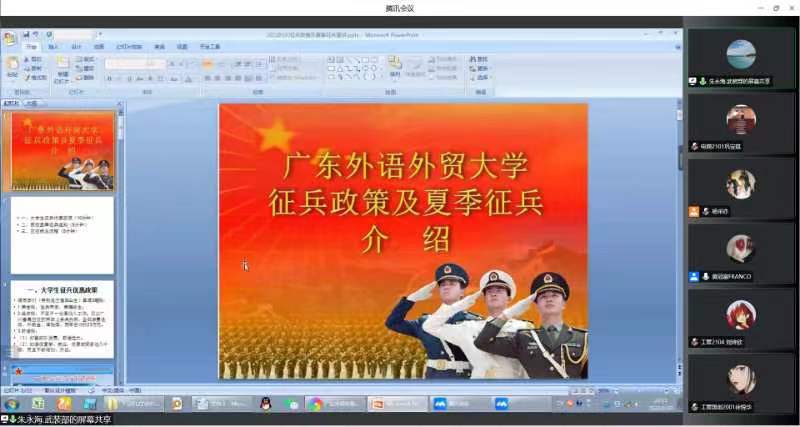 会议开始前,同学们共同观看了参军入伍的宣传片。观看完宣传片,同学们热血沸腾,纷纷在聊天框发表自己的感言,为英姿飒爽的军人们点赞。