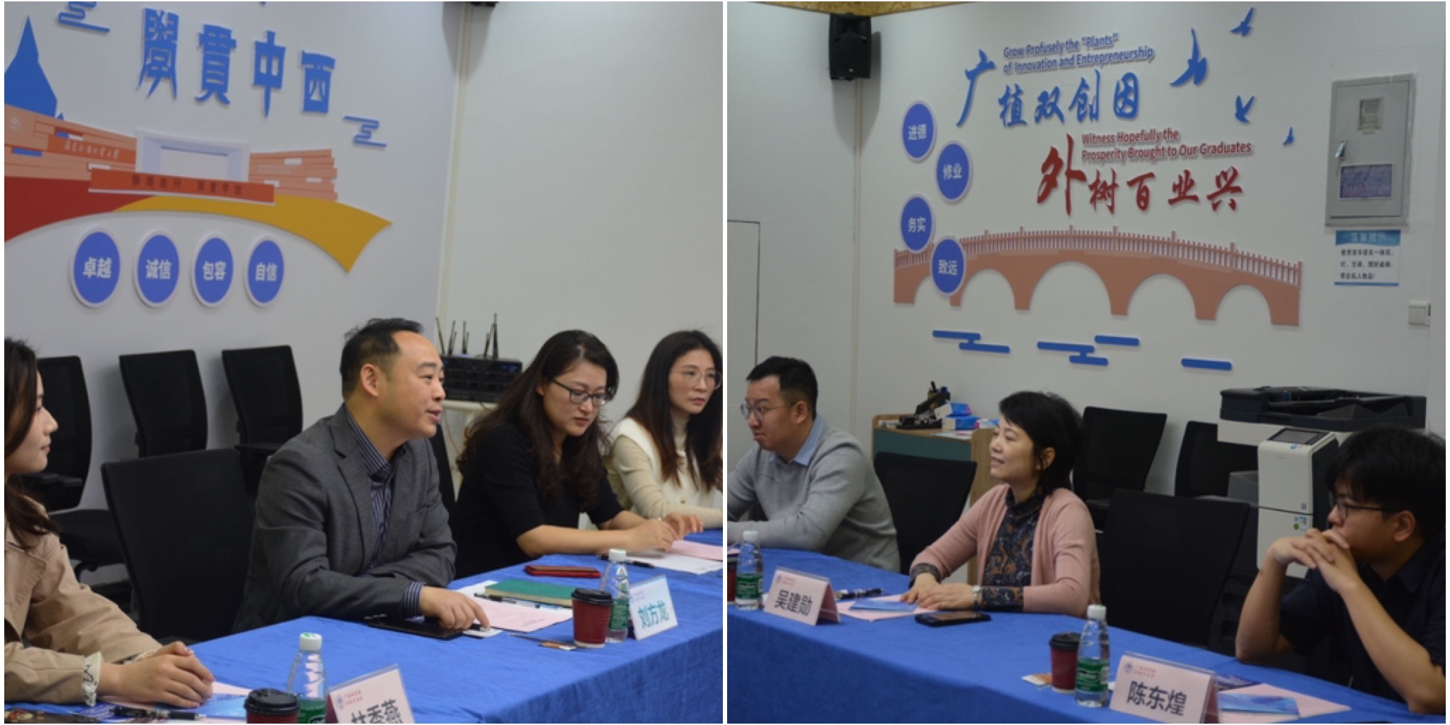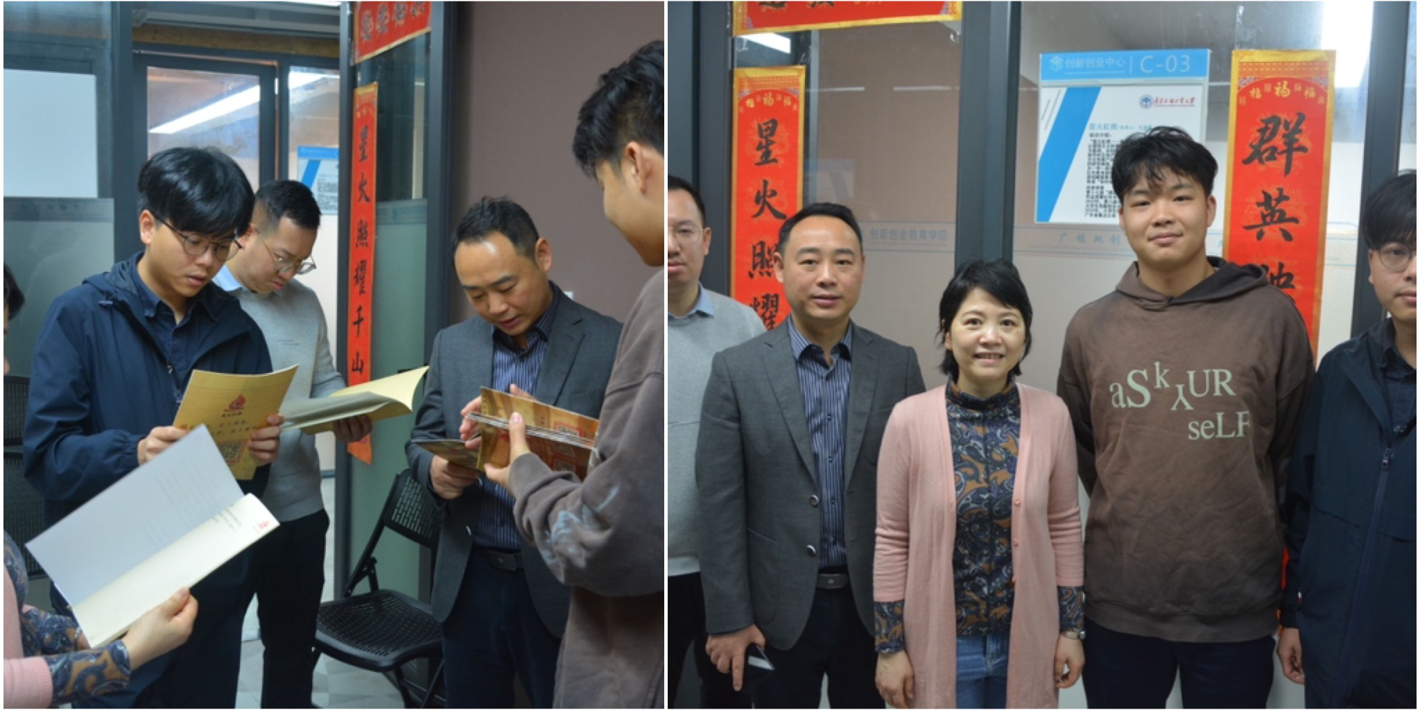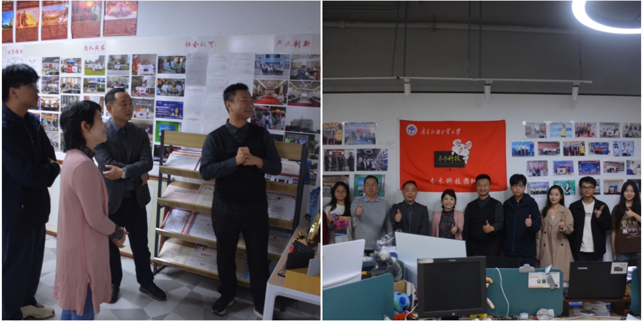 刘方龙陪同来访嘉宾走访国家级创新创业教育实践基地的各功能区域设施,并与入驻的创新创业项目学生成员亲切交流。吴建勋一行对我校国家级创新创业教育实践基地的建设成果表示赞赏,对学生创新创业项目成员的沟通与创新能力给予极大肯定。