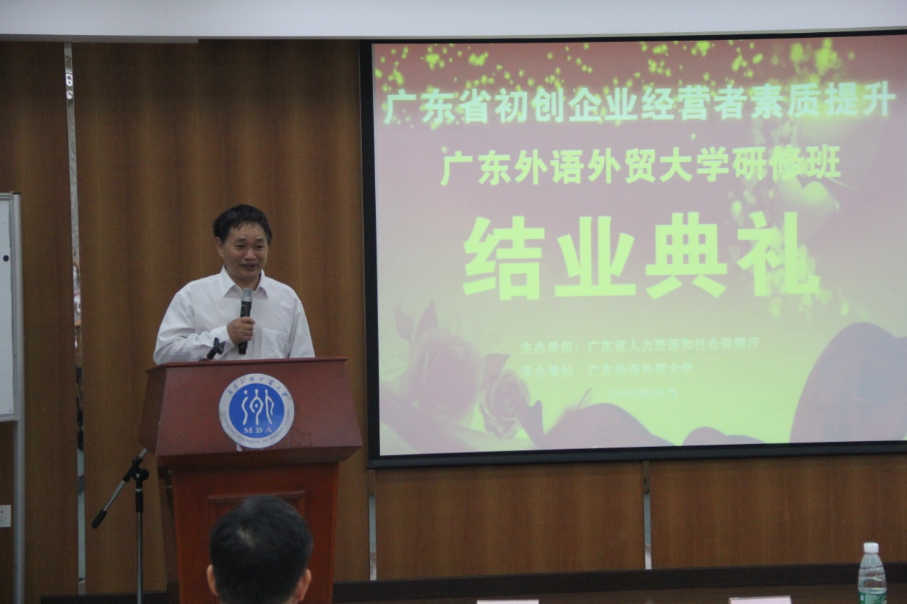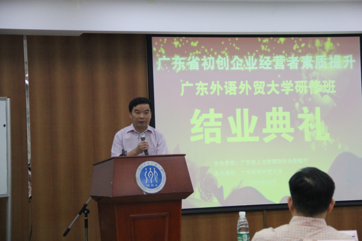 经过历时6个月的辛勤学习,首期广东省人社厅初创企业广外研修班30名优秀初创企业经营者收获了丰硕的学习成果,顺利结业!2016年5月14日,由广东省人力资源和社会保障厅主办,广东外语外贸大学商学院、就业指导中心承办,商学院领导力与组织发展研究中心(LEO)协办的广东省初创企业经营者素质提升培训--广东外语外贸大学研修班在北校MBA教育中心大楼403室举行结业典礼。省人社厅俞剑峰副调研员、商学院朱文忠执行院长、梁洁副院长共同出席结业典礼。学员代表,深圳远景无人机企业负责人李游发表结业感言,省人社厅副调研员俞剑峰代表省人社厅致辞,商学院执行院长朱文忠教授代表学校致辞,广外研修班构建了理论、实践和能力三合一的创新互动教学模式,取得良好教学效果;并衷心祝愿学员们在广外智慧平台上砥砺前行、创业成功!随后省人社厅俞剑峰副调研员、朱文忠执行院长、梁洁副院长现场为学员颁发结业证书;结业典礼结束后各位领导、嘉宾和学员一起合影留念。
