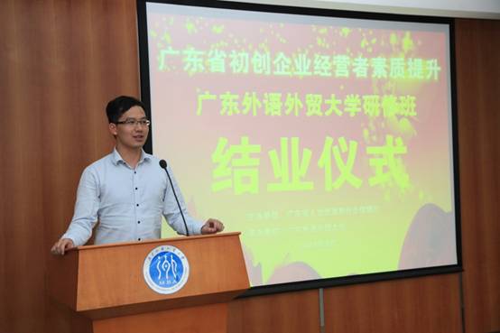 经过历时6个月的辛勤学习,2016年度广东省人社厅初创企业广外研修班30名优秀初创企业经营者收获了丰硕的学习成果,顺利结业!2017年4月22日,由广东省人力资源和社会保障厅主办,广东外语外贸大学商学院承办,商学院领导力与组织发展研究中心(LEO)协办的广东省初创企业经营者素质提升培训--广东外语外贸大学研修班在北校MBA教育中心大楼403室举行结业典礼。省人社厅俞剑峰副调研员、深圳华信资源投资管理有限公司合伙人郭涛先生、广州孵客科技企业孵化器CEO冯洪亮先生出席结业典礼。学员代表黄崇本发表结业感言,省人社厅副调研员俞剑峰代表省人社厅致辞,广外研修班构建了理论、实践和能力三合一的创新互动教学模式,取得良好教学效果;并衷心祝愿学员们在广外智慧平台上砥砺前行、创业成功!随后深圳华信资源投资管理有限公司合伙人郭涛先生、广州孵客科技企业孵化器CEO冯洪亮先生现场为学员颁发结业证书;结业典礼结束后各位领导、嘉宾和学员一起合影留念。