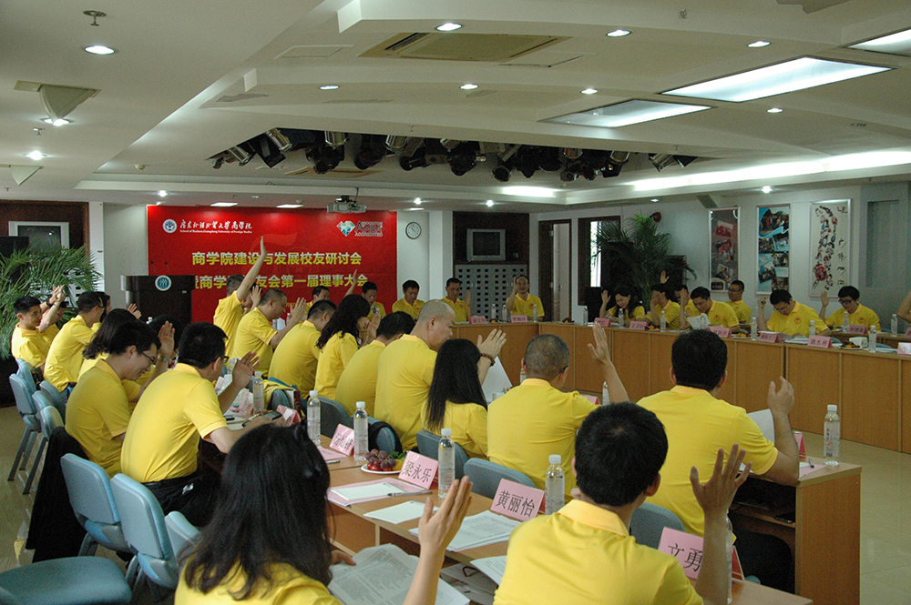 ,商学院建设与发展校友研讨会暨商学院校友会第一届理事大会在广东外语外贸大学商学院MBA教育中心401室隆重召开。会长朱文忠、执行会长许志超、商学院副院长袁登华、副院长梁洁、秘书长罗海洋以及各位名誉副会长、常务副会长、副会长、副秘书长、常务理事、理事等嘉宾出席了本次大会。许志超执行会长主持大会。