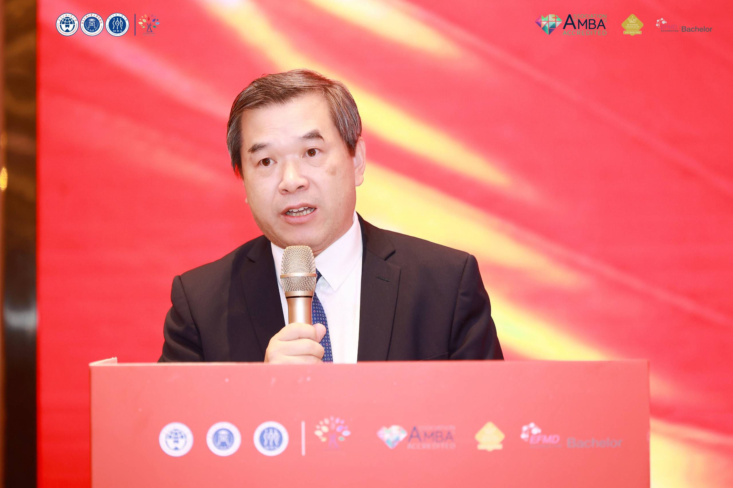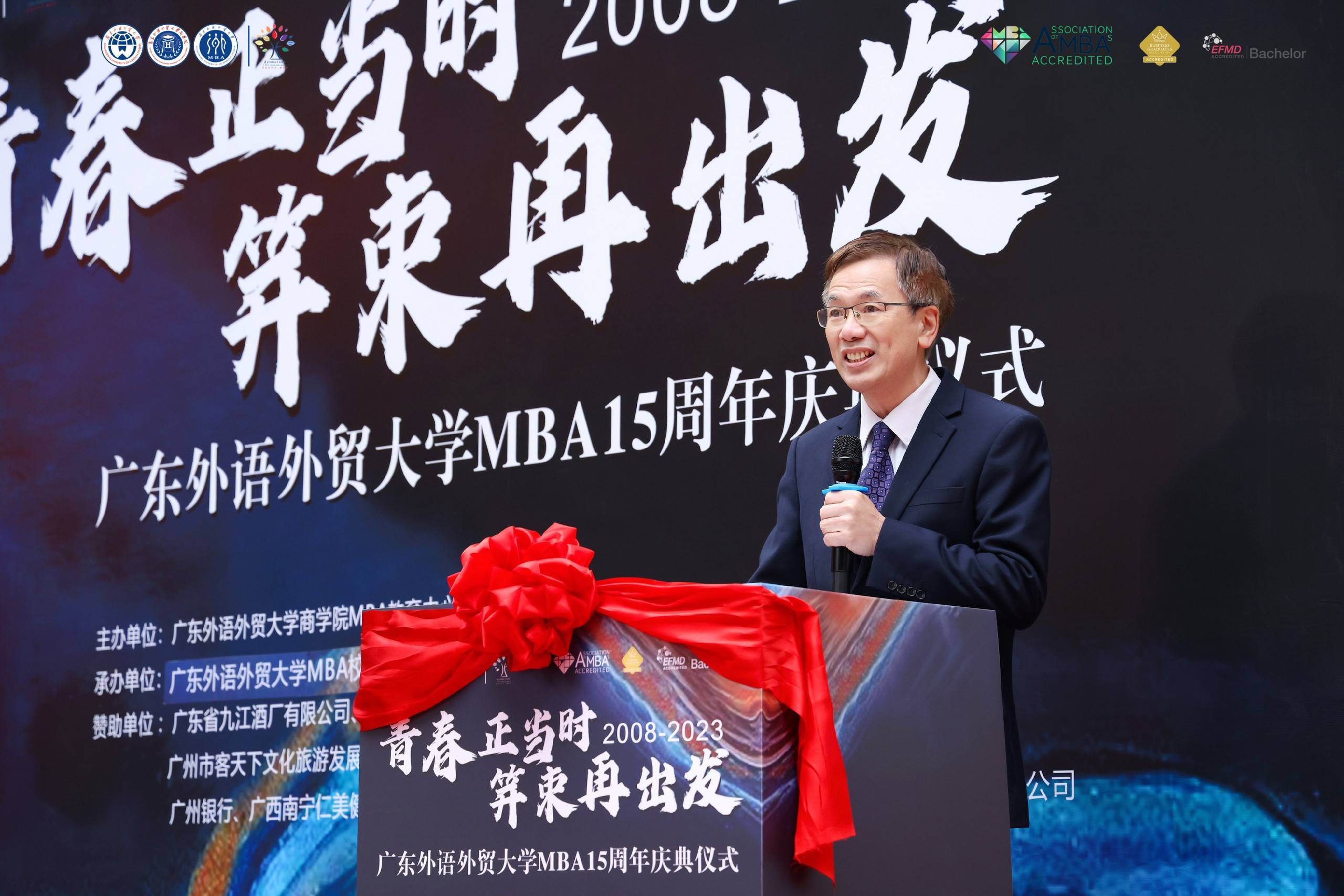何传添代表大学致辞。他首先对与会嘉宾、校友表示热烈的欢迎和衷心的感谢。他强调广外MBA坚持“全球视野、中国商道”的办学理念,以“培养融贯中西的国际化高质量管理人才”为使命,开展了形式多样的国际交流与合作项目,赢得了广泛赞誉。他期望MBA中心持续打造“国际化”和“数字化”两大特色,紧跟国际学术前沿,传播本土商科理念,并全面提升教育和服务水平,为全体MBA学生、校友创造可持续发展平台,为商学院和学校建设添砖加瓦。
