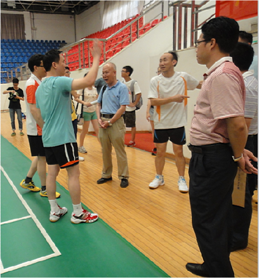 比赛开始前,管理学院院长钟育赣一行与校友进行了交流,对比赛的组织给予了肯定。他指出,管理学院的校友对母校都有深厚的感情,时刻关注着母校的发展。管理学院所取得的点滴成绩,离不开广大校友的关心和支持,希望校友们多回母校看看,也祝愿“校友杯”羽毛球赛越办越好。林明校友就校友参加比赛的情况和学院领导一行进行了说明,并表示将继续支持管理学院的建设和发展。