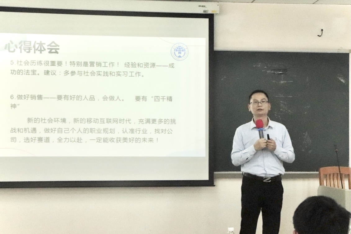 商学院2007届校友,现广东粤奇胜电气科技发展有限公司工程事业部销售总监杨宝坤,受邀开展此次主题为“直击职场——揭开‘销售’的朦胧面纱”的讲座。
