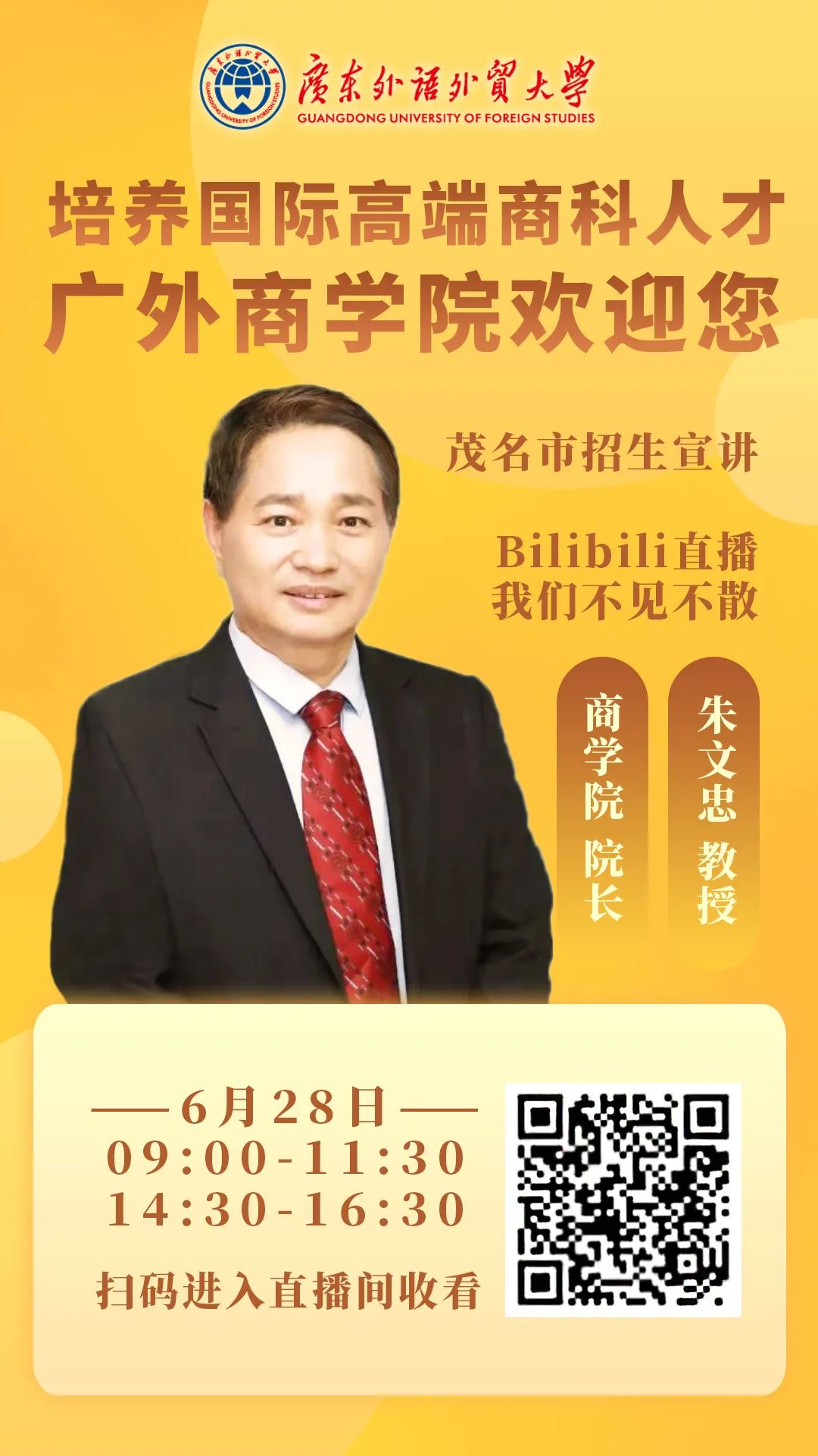 6月28日,商学院院长朱文忠教授、副院长丁浩副教授、各专业系主任以及商院优秀毕业生代表们将现场进行干货分享,解答考生疑惑,欢迎各位进入哔哩哔哩直播间收看!