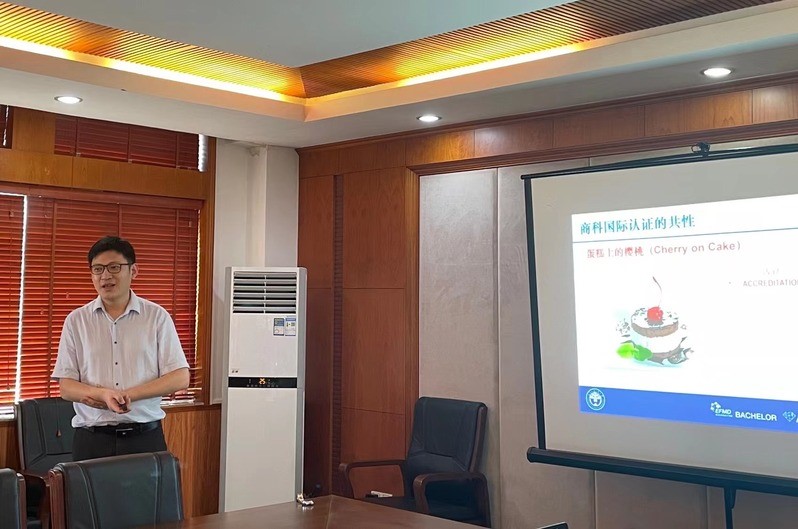 按会议议程,首先,丁浩副院长详细介绍了AACSB、EFMD、AMBA&BGA、CAMEA等商科国际认证体系,并指出国际认证对商科教育的人才培养、学科专业平台建设、国际交流合作等有积极作用;他指出,国际认证应是使命驱动的“闭环”构建,从战略、师资、学科、课程、学生、行政管理这六方面形成闭环,建设过程中要注重相关组织架构与功能的实现、注重相关制度的具体化、重视文档的整理与使用;其次他引用习近平总书记的重要讲话,认为应走中国特色的商科认证之路,在推进国际认证的过程中强调中国自信。