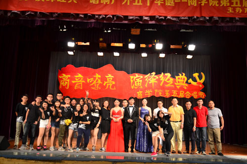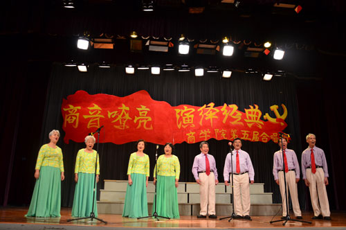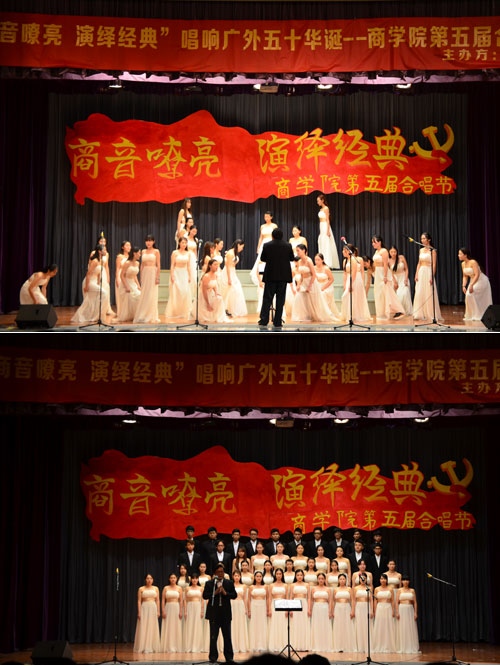 本网讯(文:张楠 图:曾俊毅)5月10日晚七点,“商音嘹亮,演绎经典”唱响广外五十华诞——商学院第五届合唱节在B8学术报告厅正式拉开帷幕。活动邀请校关工委老干部合唱团,艺术学院VIVACE合唱团共同参加演出。商学院党委书记许志超、辅导员刘富先等莅临本次合唱比赛。学生处黄星老师、国际学院张海强老师、我院团委书记李晟老师担任本次大赛评委。