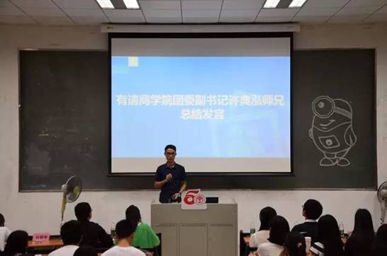 大会的最后,有商学院团委副书记许典泓师兄总结发言。他总结概括了这次会议的特点与意义,并且号召团干班干为明年站上讲台展示发言而加油。他指出,作为团干班干,要做到两点:一是明确自己的责任,做好班务工作;二是要明确目标,以拿下先进集体标兵为目标,建设班集体。他甚至讲述了自己的亲身经历,告诉我们学习氛围对于一个班级的重要性。并且告诉新一任团干班干们:如果你的热情退却了,请用责任顶上。