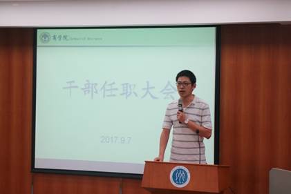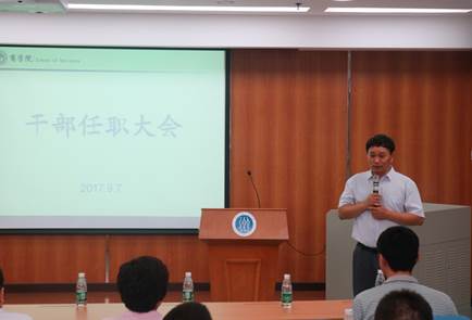 丁浩发表任职感言。他首先感谢组织的信任和关心,感谢学院领导、老师们的教导和帮助。认为自己有很多不足,还需要进一步学习和提高。他表示,上任后将把国际认证工作作为重中之重,相信在学院领导班子的通力合作下,在全体老师的共同支持下,一定会高质高效地完成国际认证工作,为我们的商学院增添更新更美的光彩。