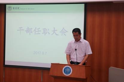 9月7日下午,我院在北校区第九教学楼403会议室召开干部任职大会。副校长焦方太,组织部部长方迎生、院领导班子成员和教职工代表参加了会议。会议由院长朱文忠主持。