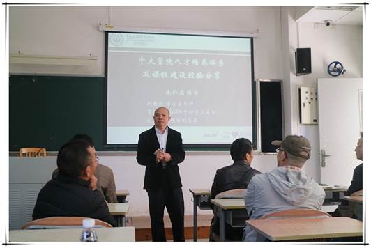参会领导和老师稍事休息后,教研活动进入下一个环节:中山大学朱仁宏副教授作了题为《中山大学管理学院人才培养体系及课程建设经验分享》的讲座。