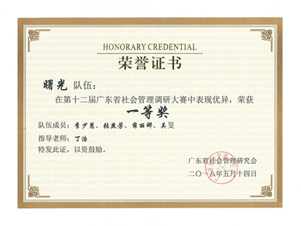 2018年5月底,第十二届广东省社会管理调研大赛落下帷幕。广外商学院2015级工管专业李少慧同学担任队长组建“曙光”队伍参加比赛,团队成员包括广外商学院2016级硕士研究生张燕芳(工管2012级推免生)、暨南大学2017级硕士研究生薛丽娜(工管2013级推免生)和国际商务2016级学生吴旻,商学院副院长丁浩担任指导老师。