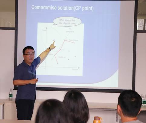 首先,马秋卓博士分享了题为“Low-carbon Airline Fleet Assignment: A Compromise Approach”的论文成果。他结合在研究中运用的多目标优化方法,构建模型公式,用椭圆寻找理想值到凹集的最优点,以解决排放最小化与利润最大化目标以及水平航线中机型安排的实际问题。期间,马秋卓博士还分享了他与合作者之间联系的趣味故事以及有关航空领域的知识普及。