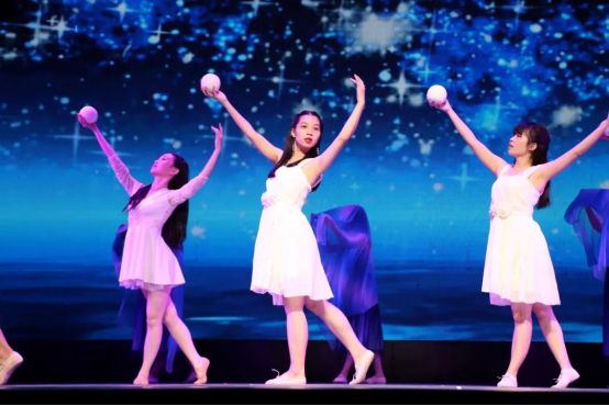 民舞队在暖场过后翩然登场,蓝与白相间的舞蹈让人赏心悦目,青春演绎“星并不远梦并不远只要你踮起脚尖”。