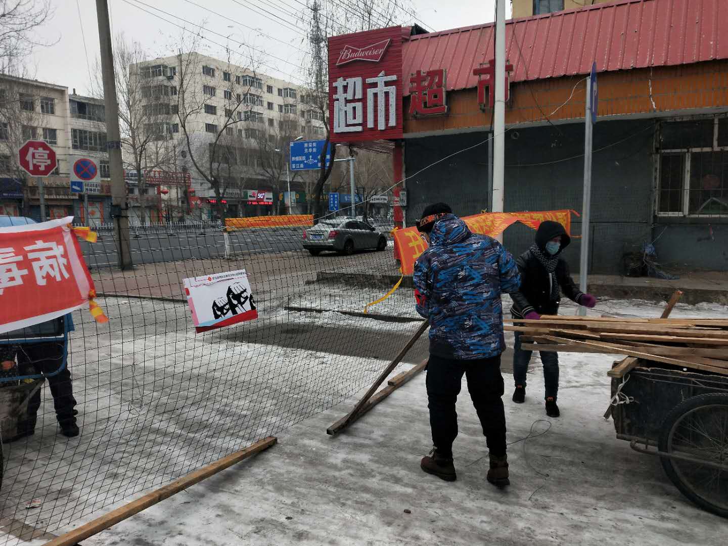 范贺尧的主要工作是协助封锁小区、设置及修补围栏、检查进出人员、在辖区内巡逻督导等。伴着风雪交加的严寒天气,防疫工作并不容易,地面大面积结冰,稍不注意就会摔跤。偶尔还有个别居民故意破坏封闭设施、顶撞工作人员、不配合检查工作。“社区老年人较多,有时很难跟他们解释清楚疫情的现状和封闭措施的重要性,这也为工作增加了难度。”范贺尧说。