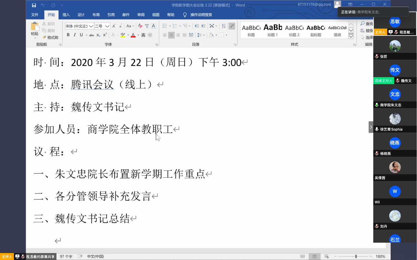 魏传文介绍了学院疫情防控期间开展的相关工作,他指出召开这次会议对确保疫情期间线上教学顺利进行、学院各项工作有序推进具有重要意义。