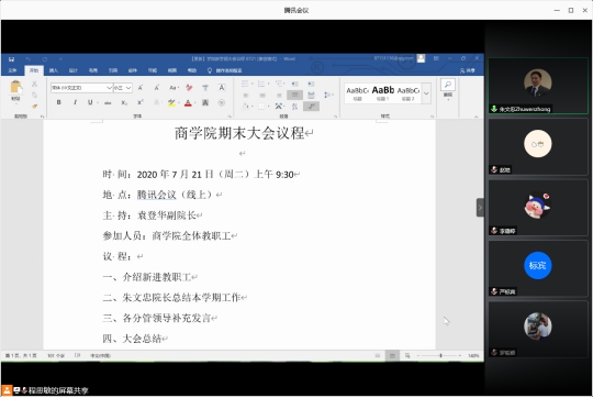 7月21日上午,商学院2019-2020学年第二学期期末总结大会在线上召开。商学院全体教职工参加会议,副院长袁登华主持会议。