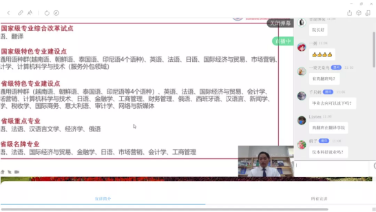 2021年4月3日上午,在大学教务处招生办的部署指导下,商学院代表广外在线上面向重庆考生家长开展招生宣传。在直播中,朱文忠院长以“遇见广外,预见未来”为主题就广外的基本概况、学科建设成效、商学院人才培养特色和优势等方面进行直播宣讲,直播实时观看人数超三百人,取得良好的宣传效果。