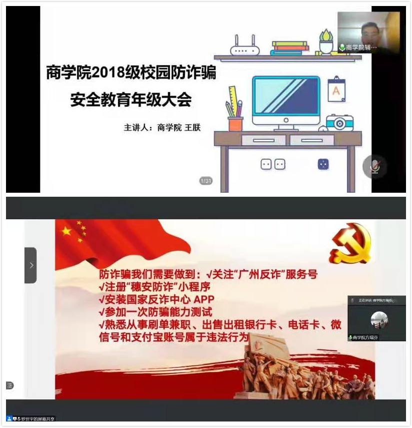为增强商学院学生防诈骗意识,切实提高学生安全防范能力,构建和谐平安的校园环境,6月15至18日,商学院各年级在线上召开反诈骗知识宣讲会。各年级辅导员担任宣讲员。