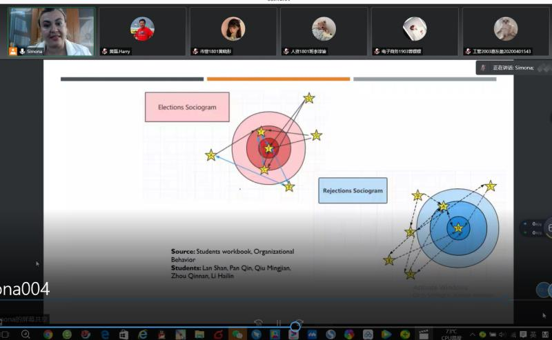 “工商管理系列讲座第11讲”于7月7日上午举办,由罗马尼亚籍外教Elena Simona Tomozii博士主讲。讲座的主题为Managing employees from hell. What is social cohesion and how does it help our organization? How we measure it? 旨在通过社会凝聚力的量化模型指导听众在工作或日常生活中更好地理解自己在团队中的角色从而做出调整。Simona首先让大家了解了社会凝聚力在管理人力资本方面的重要性。并在对相关概念和方法进行简单介绍后,直接引导同学们通过事先准备好的纸笔等工具,跟着她指定的步骤一起操作。在讲座开展的过程中,Simona详细地向听众展示了如何绘制社会关系图,再根据社会关系图计算出相关取值,从而达到量化社会凝聚力的目的。