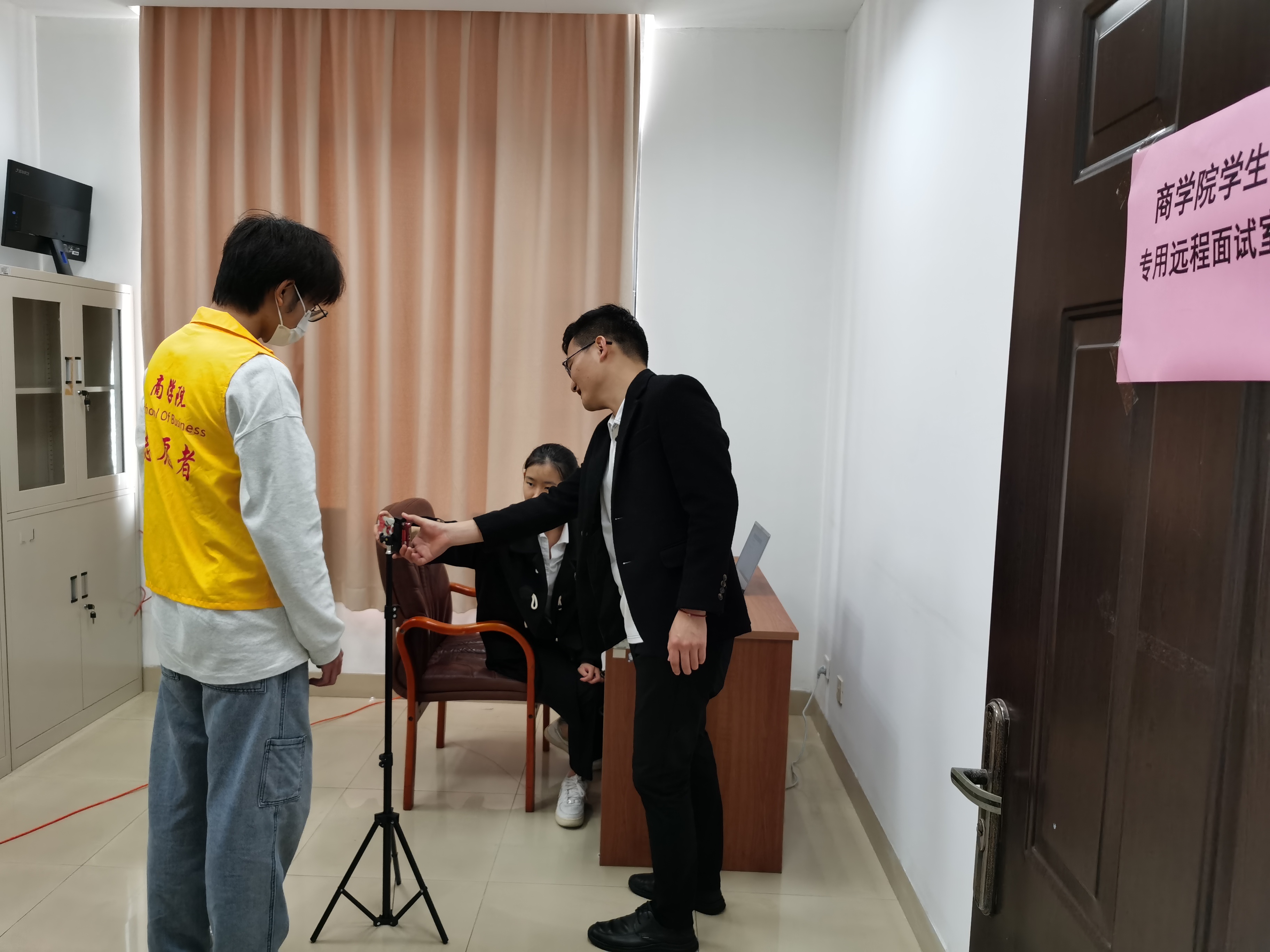 开展党史学习教育以来,商学院将“为学生办实事”作为各项工作的重要抓手,多渠道调研解决学生急难愁盼问题,确保党史学习教育成果转化为解决学生困难的具体举措。近期,大四毕业生“面试难”问题突显,为帮助学生解决疫情期间外出面试不便、考研面试缺少场地等问题,商学院积极协调,在院系办公楼专门开设多间学生专用远程面试室,面向全院学生开放,助力学生考研、实习和就业。