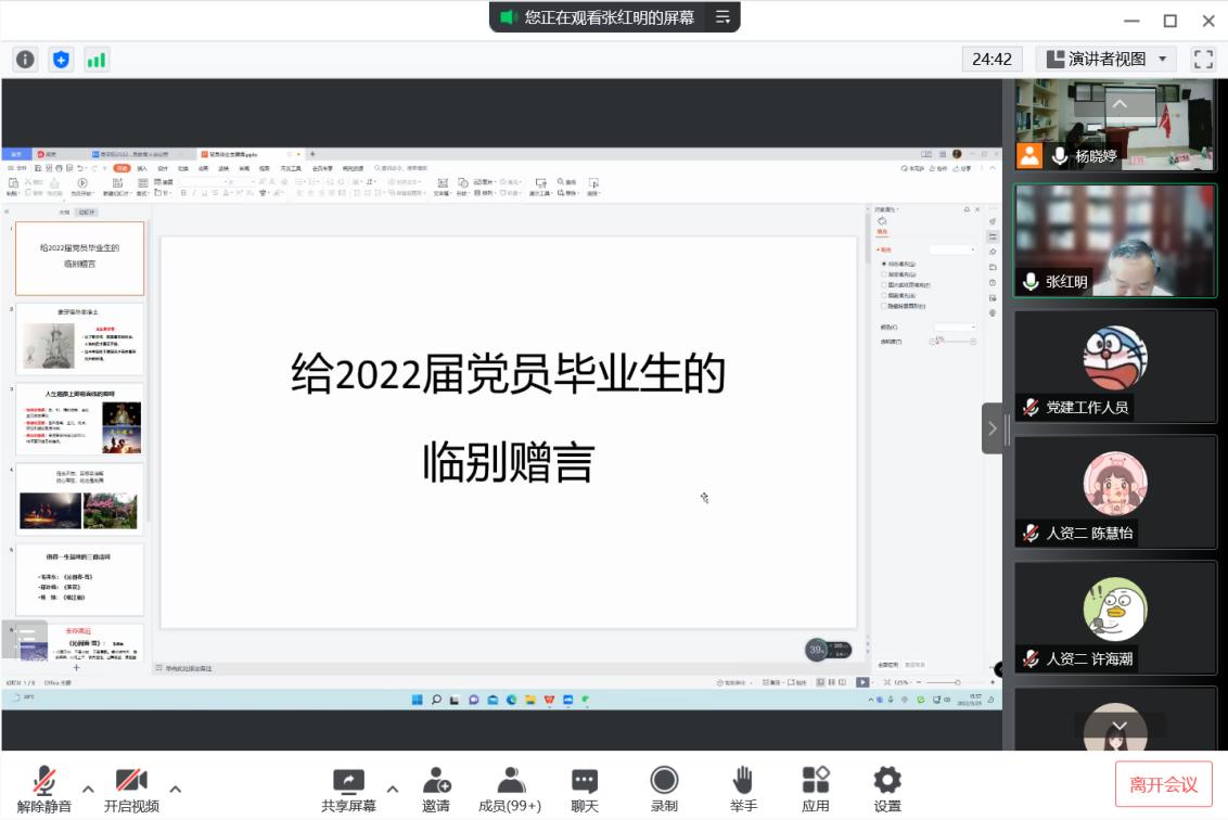 随后,教师党员代表张红明同志发言。他勉励毕业生党员们:出了“象牙塔”就是真实的社会,人生的路才真正开始,希望各位毕业生党员在工作或升学时能够保持一往无前的奋斗姿态,保持廉洁清正,时刻牢记党员身份、铭记初心使命,在强国逐梦的新时代中实现人生价值、绘就青春篇章。