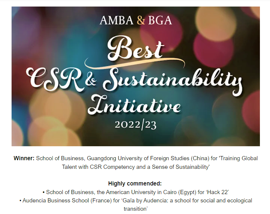 12月9日,英国工商管理硕士协会与商科毕业生协会(AMBA&BGA)举办了全球商科卓越奖颁奖仪式,我校商学院荣获最佳企业社会责任与可持续发展举措金奖,商学院副院长(主持工作)袁登华教授出席线上颁奖典礼并视频致辞。这是历届以来中国院校首次获得该项荣誉,埃及开罗美国大学商学院和法国南特高等商学院分别获得该奖项的银奖和铜奖。