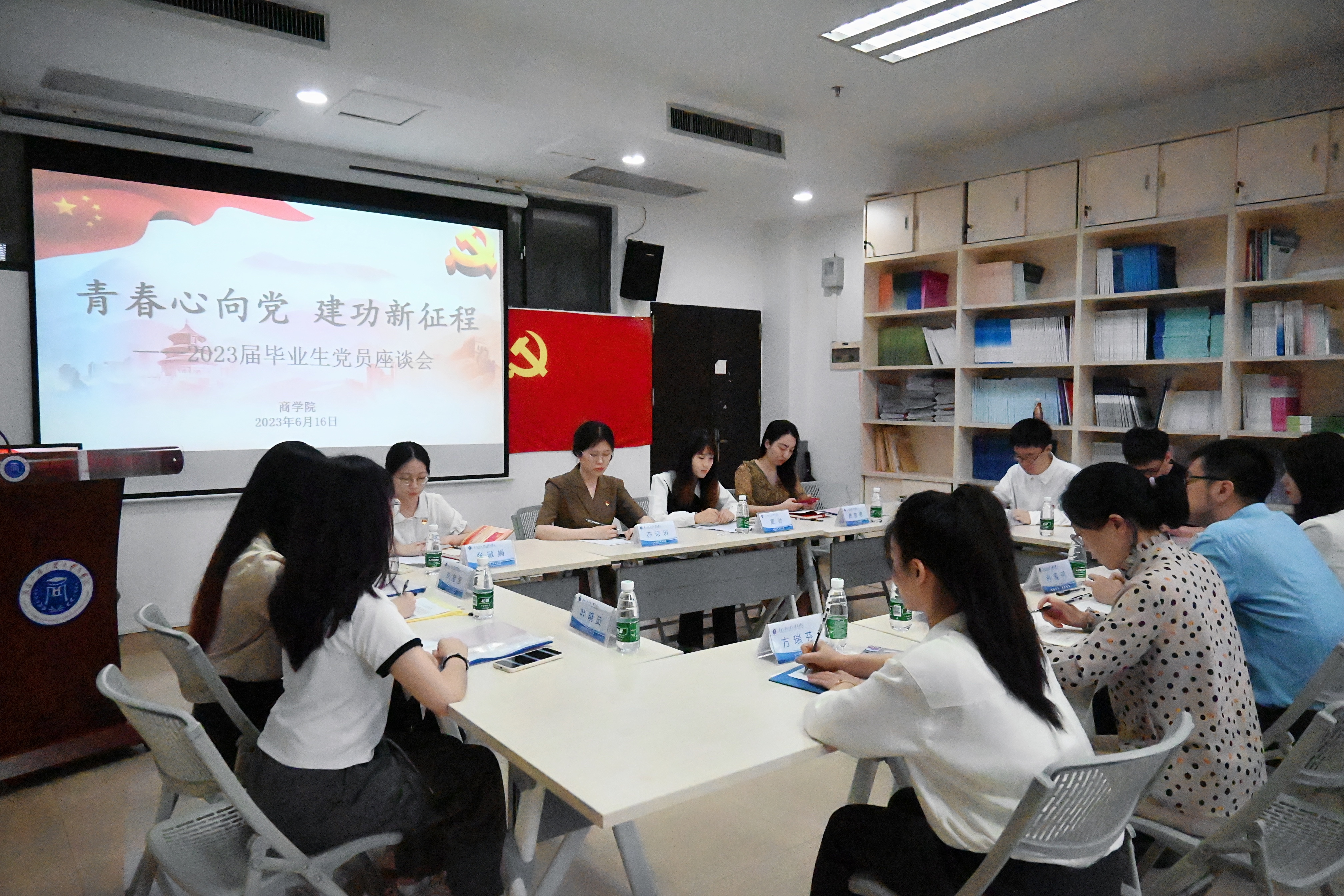 2023年6月16日,商学院2023届毕业生党员代表座谈会在大学城校区院系办公楼366会议室举行。本次会议结合主题教育要求,围绕“青春心向党,建功新征程”展开交流。商学院党委书记肖喜明、党委副书记沈长霞、党委组织员向媛薇、学生党建研究会指导老师方瑞芬及各支部毕业生党员代表出席。本次座谈会由沈长霞主持。