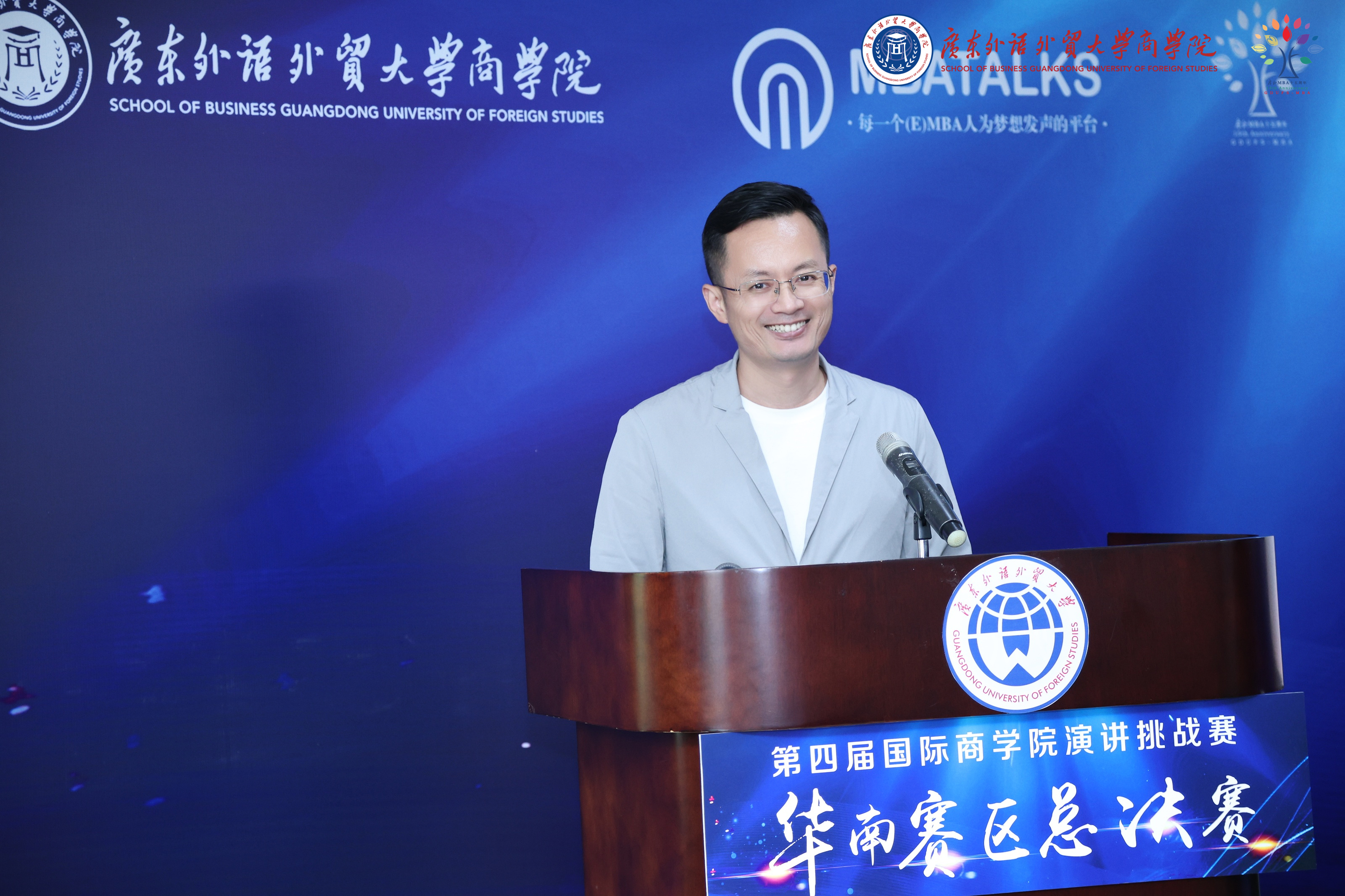 国际商学院演讲挑战赛执行主席钱多多首先对华南赛区主办方广外商学院及各参赛单位的鼎力支持表示感谢。他强调,国演赛肩负着“讲好中国MBA人故事、传播中国MBA人声音”重要使命,影响力覆盖中国近200所商学院。国演赛主题“讲述你的故事”,倡导社会主义核心价值观,传播积极向上的正能量,秉承“与智者同行”核心理念,倡导MBA人通过演讲“绽放魅力,连接彼此”。最后钱多多预祝华南赛区总决赛取得圆满成功,并邀请入围队伍参加全国总决赛。