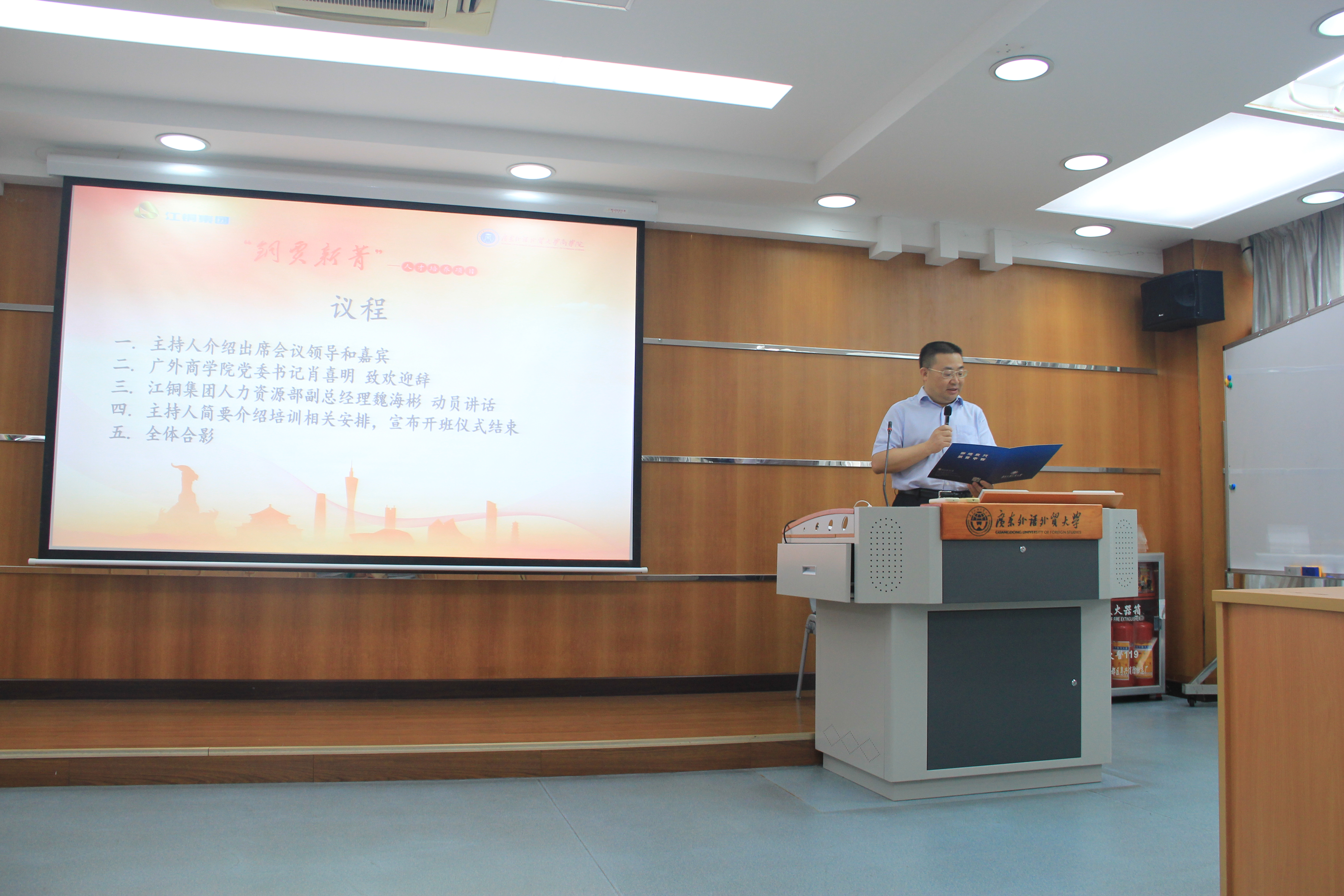 2023年9月13日,为深入贯彻党的二十大精神,促进高校与企业的双向赋能,由世界500强的江铜集团主办、广东外语外贸大学商学院承办的江铜集团“铜贾新菁”人才培养项目第二期专题培训班,在广外白云山校区第九教学楼203课室举行开班仪式。广外商学院党委书记肖喜明、副院长(主持工作)袁登华、江铜集团人力资源部副总经理魏海彬、教培中心培训管理部副主任徐志康、广外商学院MBA教育中心行政团队及江铜集团48位学员出席此次培训的开班仪式。开班仪式由袁登华主持。