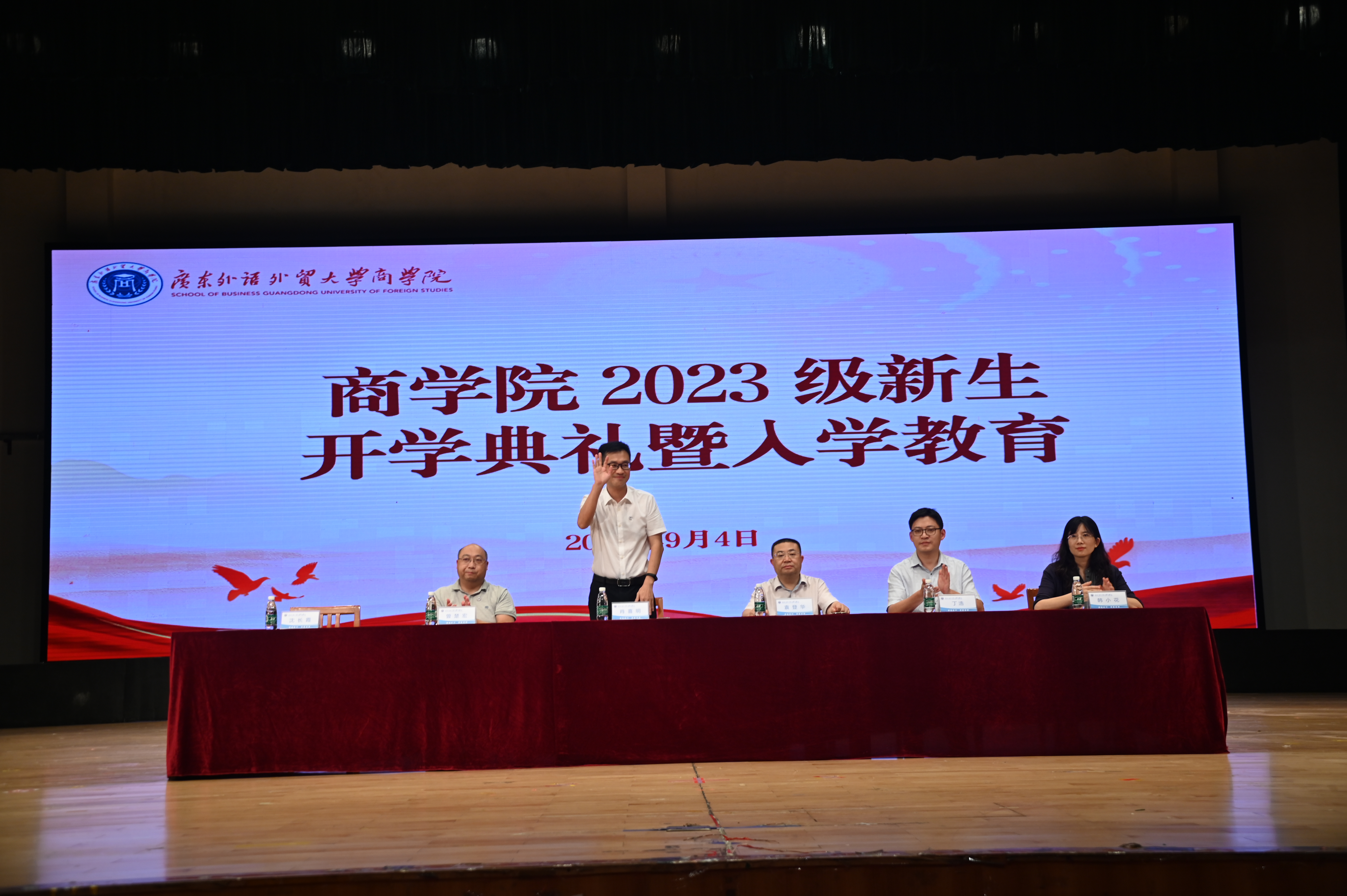 9月4日下午,商学院2023级新生开学典礼暨入学教育在大学城校区大会堂举行。商学院领导班子、教师代表、全体辅导员及2023级全体新生共同参与。袁登华副院长(主持工作)进行致辞,他强调广外商学院是以“全球视野、中国商道”为办学定位,以“培养国际高端商科人才”为使命,以“成为国际化特色鲜明的高水平商学院”为愿景的商学院,并生动介绍了学院悠久的发展历程、健全的学科体系、成绩突出的国际认证成果和特色鲜明的人才培养目标。商学院党委书记肖喜明以“信仰的力量”为主题,为同学们讲授开学第一课,他以“万里长征”、“脱贫攻坚”、“抗疫精神”等为例,带领新生共同认识和感悟信仰的力量,他号召同学们积极向党组织靠拢,坚定地在党旗下成长,做到理论与实践相结合,努力成为新时代新青年。