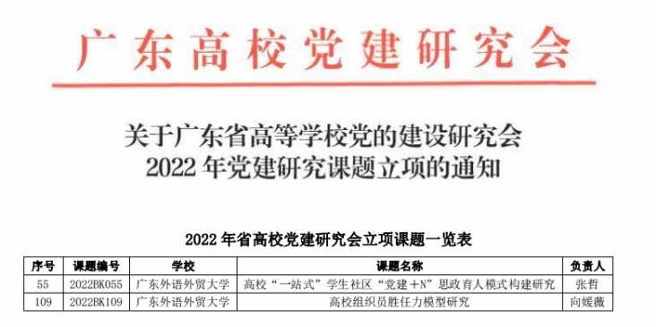 近日,广东省高等学校党的建设研究会公布了2022年党建研究课题立项结果,我院2项课题获得立项,全校共获立项5项,我院立项率占全校立项数40%,立项数量创历史新高!本次我院获省党建2项课题立项,是我院在实现省级样板党支部突破后,在学院党建工作上取得的又一重大进展,标示着学院党建向“理论+实践”的双轨并进、相互支撑的科学、合理、有效的方向发展。