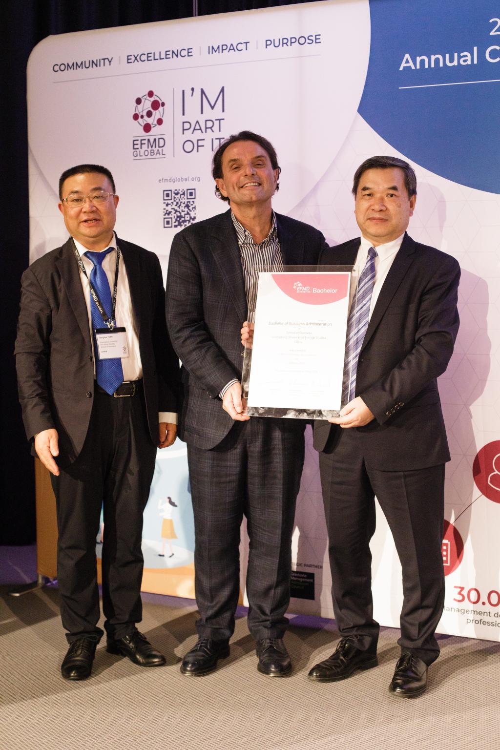 6月12日,我校副校长焦方太、商学院副院长(主持工作)袁登华出席在法国里昂举办的欧洲管理发展基金会(European Foundation for Management Development,简称EFMD)年会,深入了解了管理教育国际认证体系的发展趋势及最新要求,同与会的国外部分高校代表进行了深入交流,探索国际合作新途径。焦方太代表学校获颁EFMD工商管理本科项目国际认证证书。