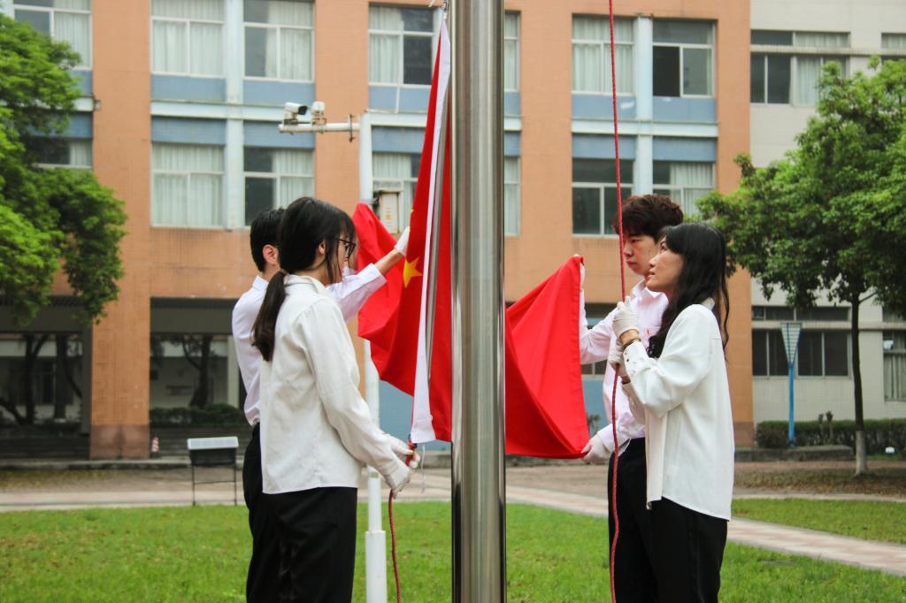 六点五十分,师生们到达教学楼中庭参加升旗仪式。在全体同学的注视下,旗手们迈着整齐有力的步伐,护送鲜艳的五星红旗入场。七点整,五星红旗随国歌冉冉升起,迎风飘扬,现场庄严肃穆,全体师生行注目礼。